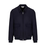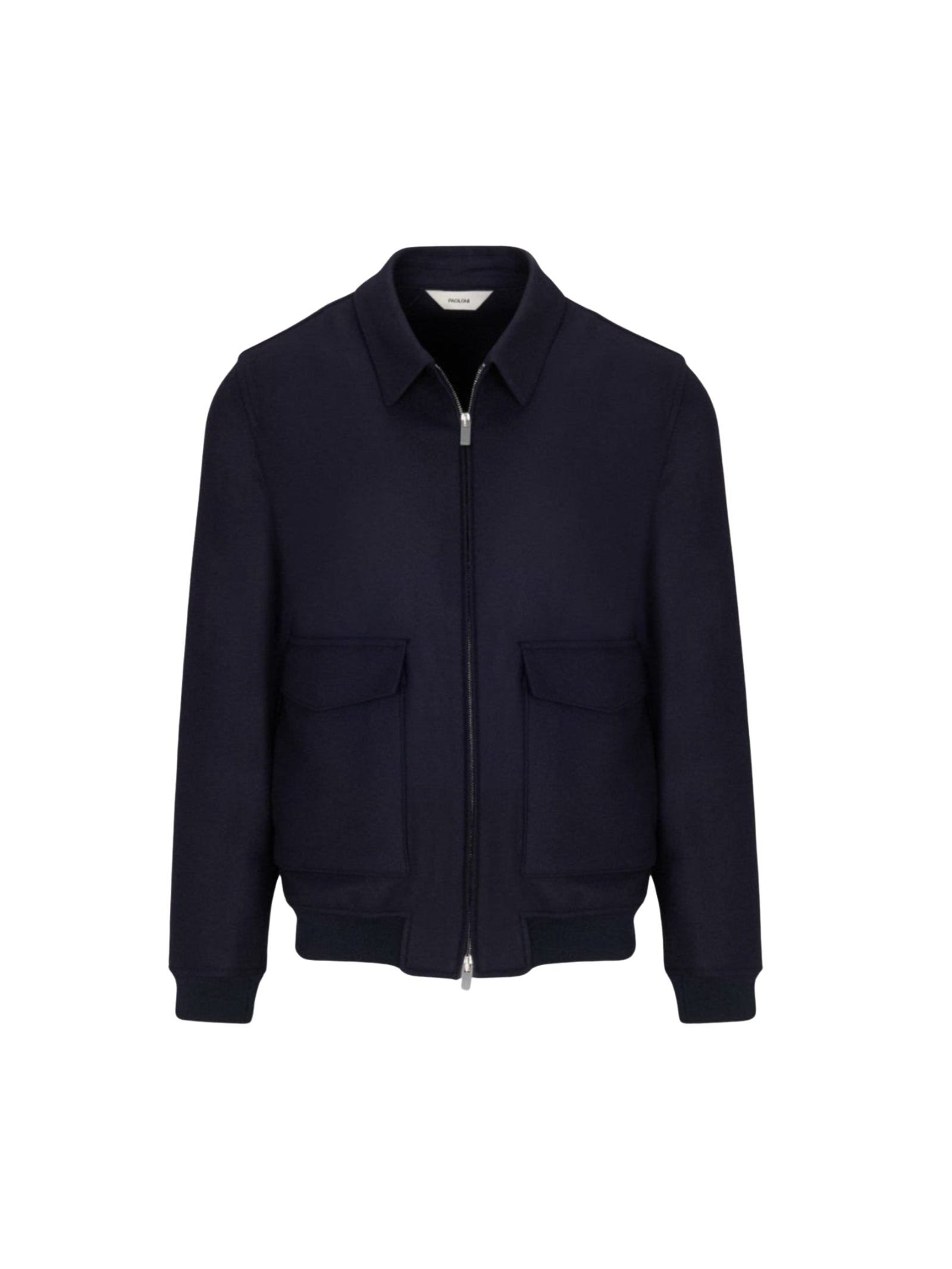 Shirt collar jacket, two front flap pockets, zip fastening, ribbed hem and cuffs, stitched trim. Lightweight wool blend cloth