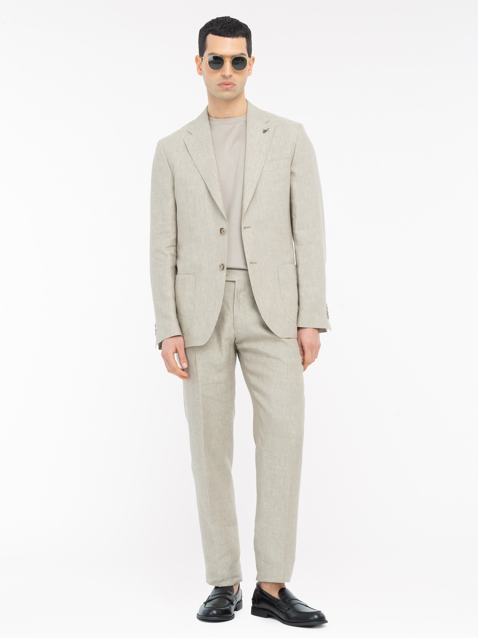 Drop 7 lined suit. Blazer: two button fastening, two patch pockets and one breast pocket on the front, side slits at the back, three buttons at the cuffs, topstitched trim. Trousers: one pleat, two America pockets ans two welt pockets with button on the back, waist loops, zip and button fastening, 17.5 cm hem. Pure linen canvas