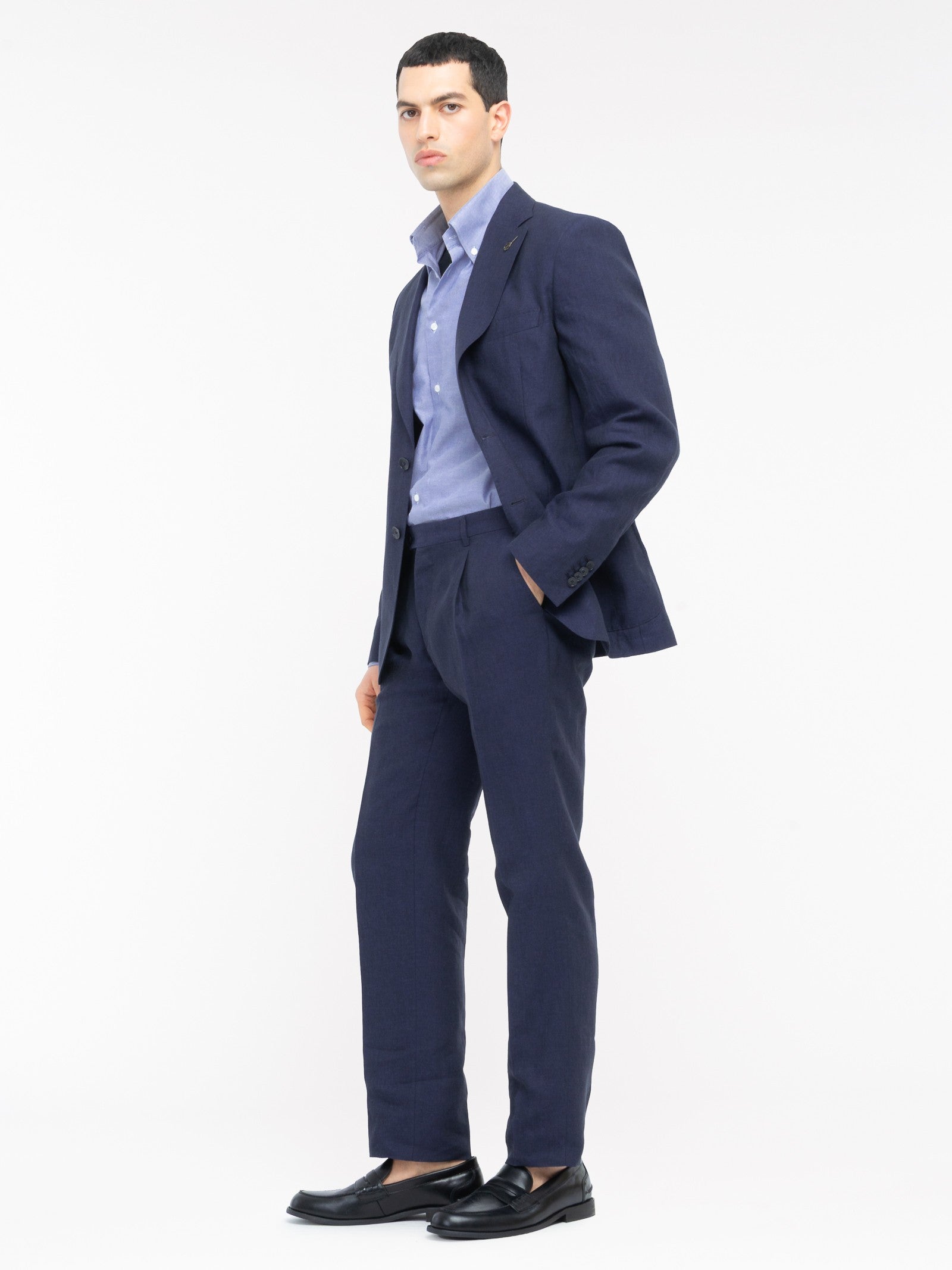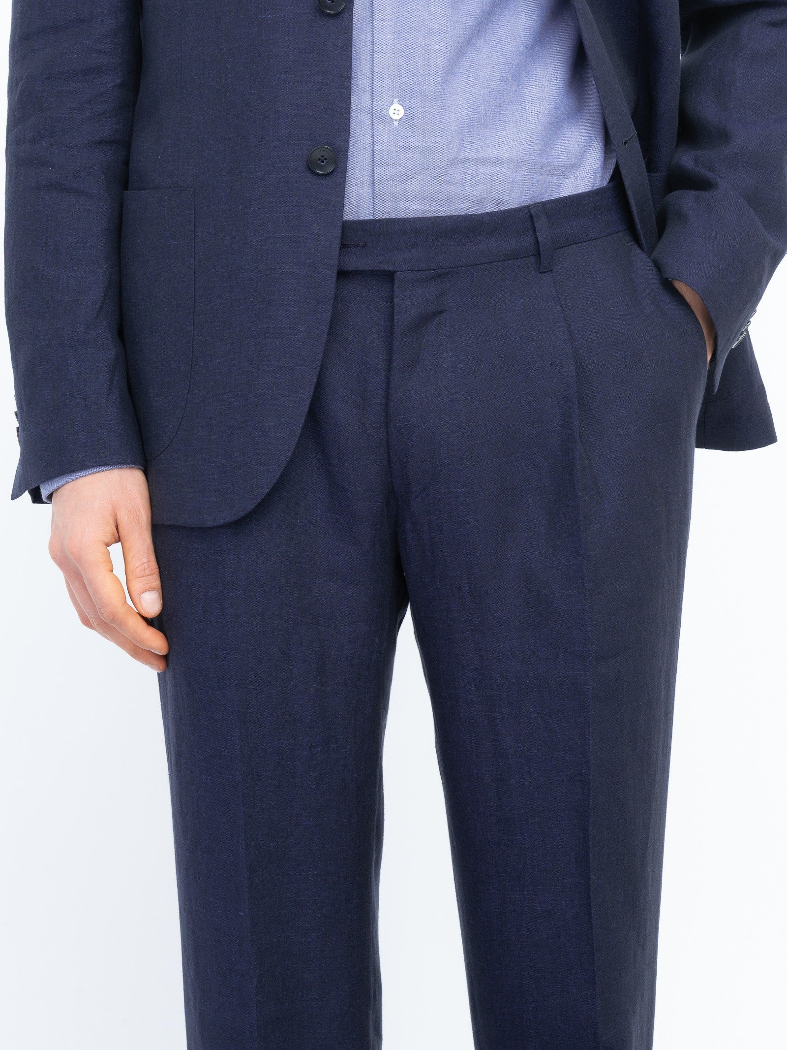 Drop 7 lined suit. Blazer: two button fastening, two patch pockets and one breast pocket on the front, side slits at the back, three buttons at the cuffs, topstitched trim. Trousers: one pleat, two America pockets ans two welt pockets with button on the back, waist loops, zip and button fastening, 17.5 cm hem. Pure linen canvas