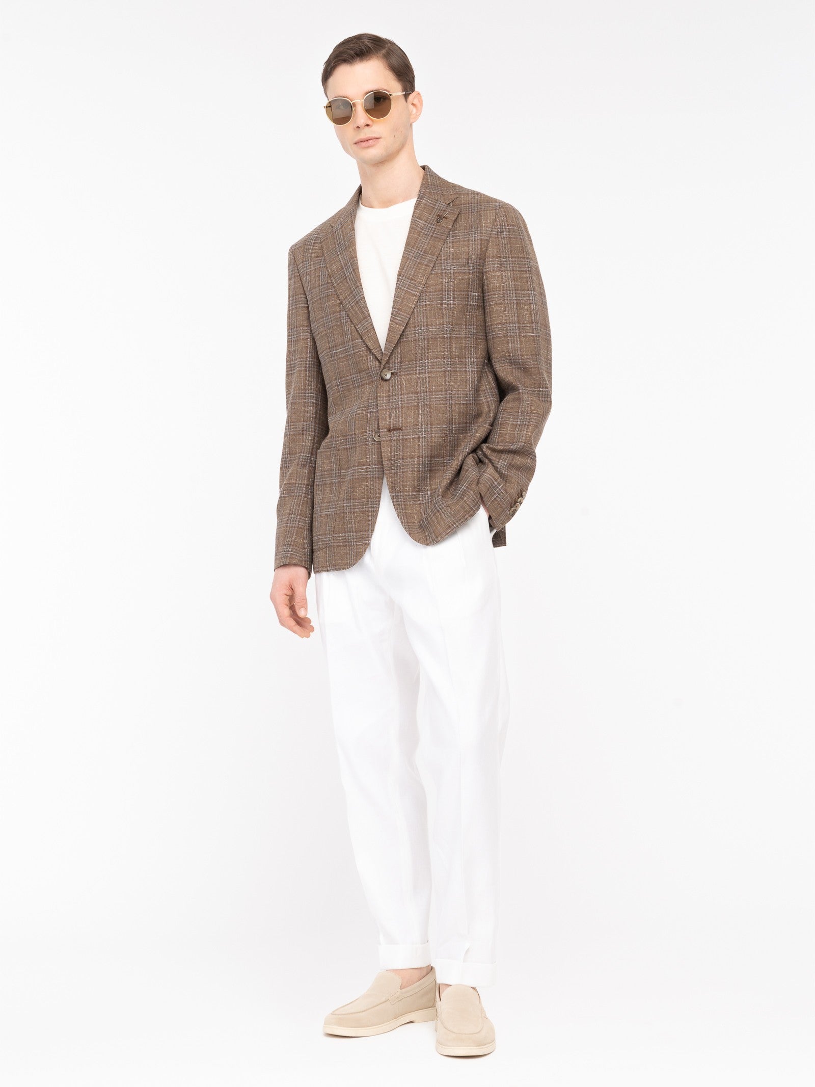 Unlined blazer with two button fastening, two patch pockets and one breast pocket on the front, four buttons at the cuffs, side slits at the back, topstitched trim. Blended wool and cotton macro check