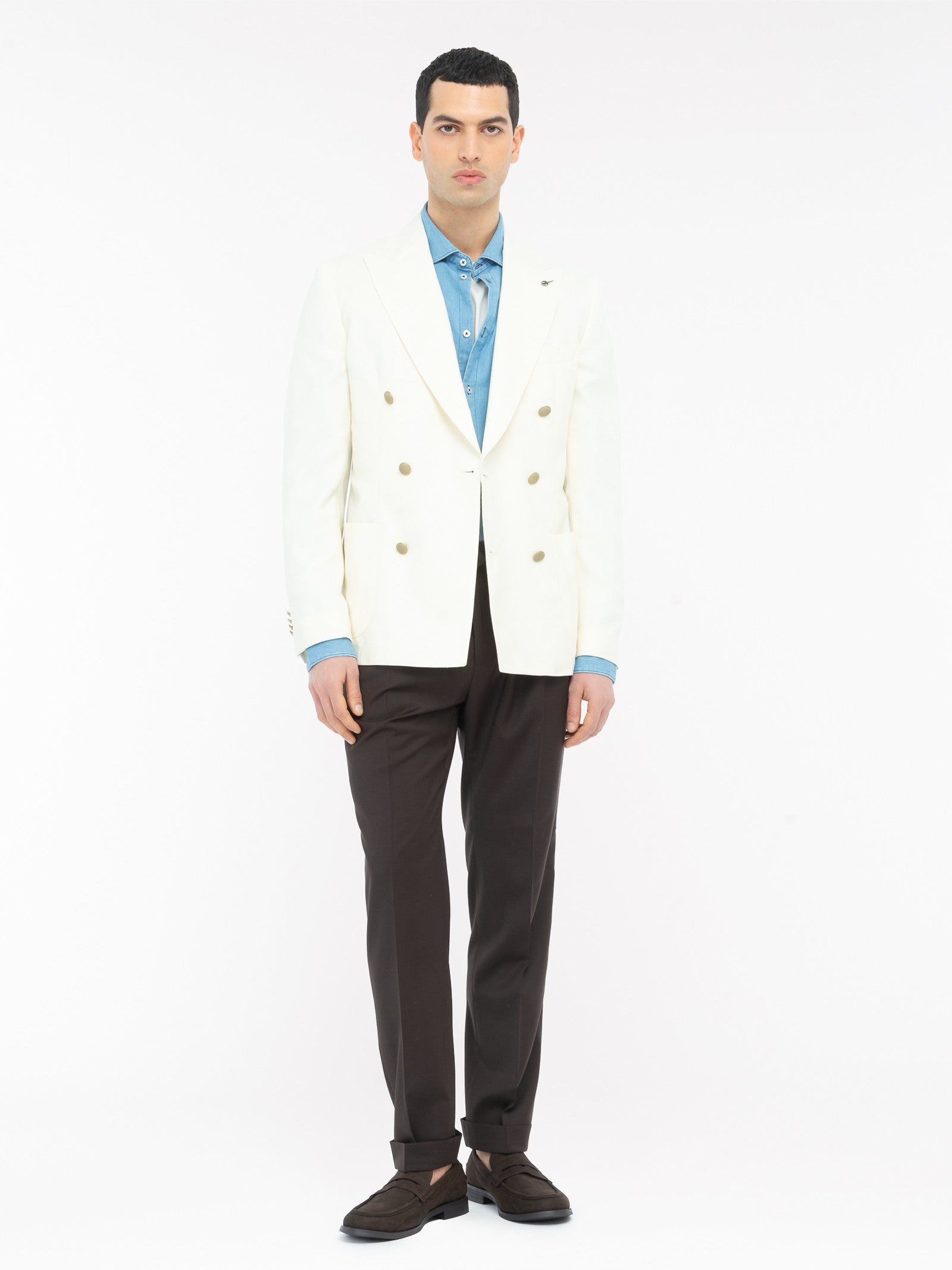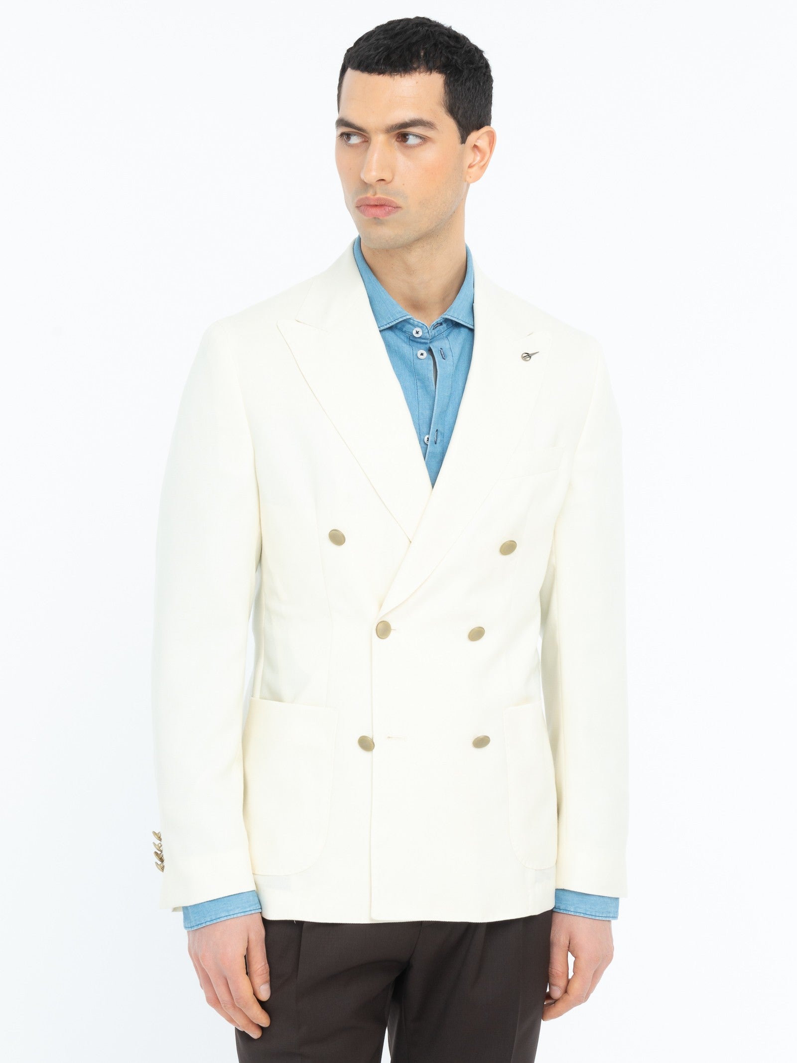 Unlined double breasted blazer, metal button fastening, wide peaked lapels, two patch pockets and a breast pocket on the front, four buttons at the cuffs, side slits at the back, topstitched trim. Super 110's virgin wool micro texture