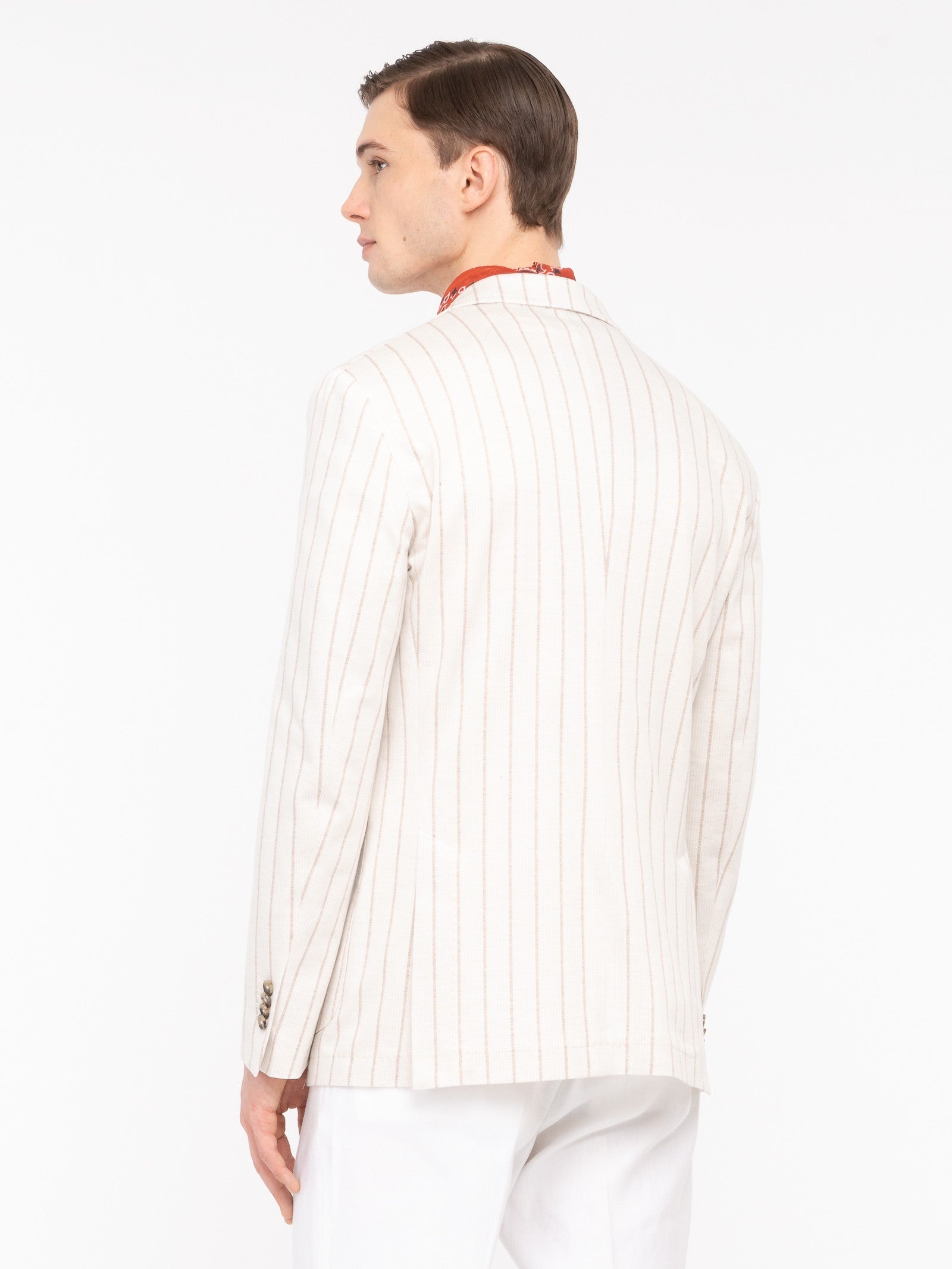 Jersey blazer with two button fastening, two patch pockets and one breast pocket on the front, side slits at the back, four buttons at the cuffs, topstitched trim. Pinstriped cotton jersey