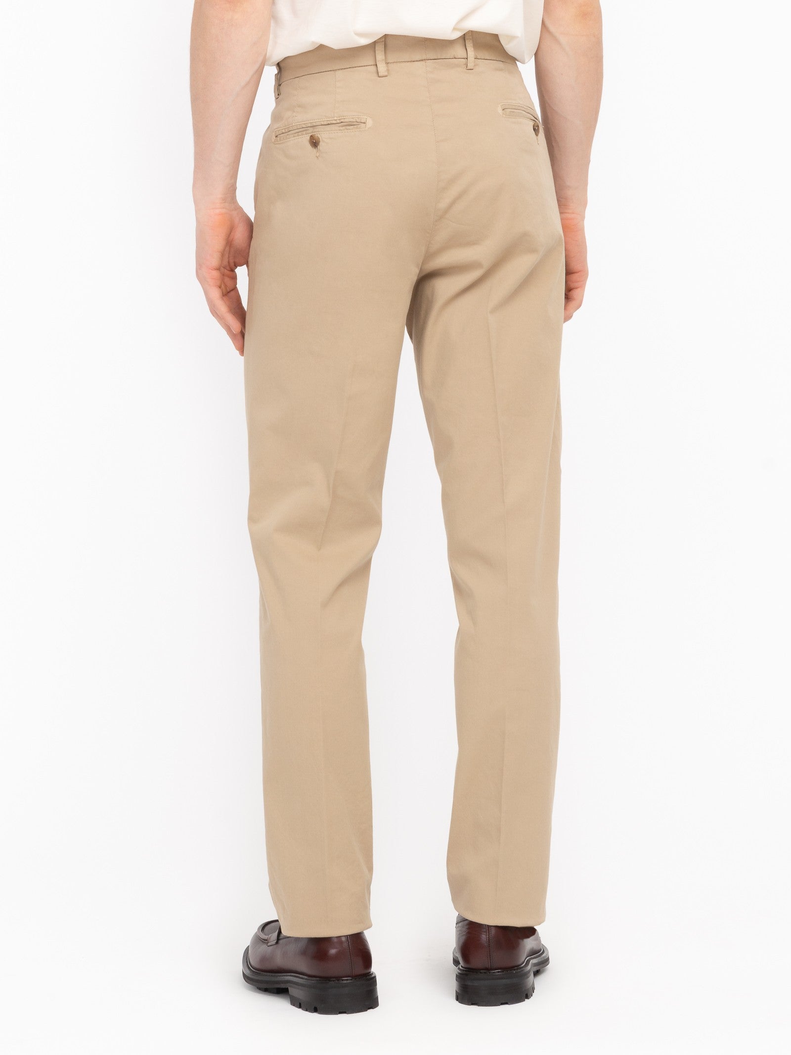 Pantalone chino tinto capo slim fit, due tasche america e un taschino frontali, due tasche a filo con bottone sul retro, passanti in tono in vita, chiusura con zip e bottone fondo 17,5 cm. Gabardina di cotone stretch