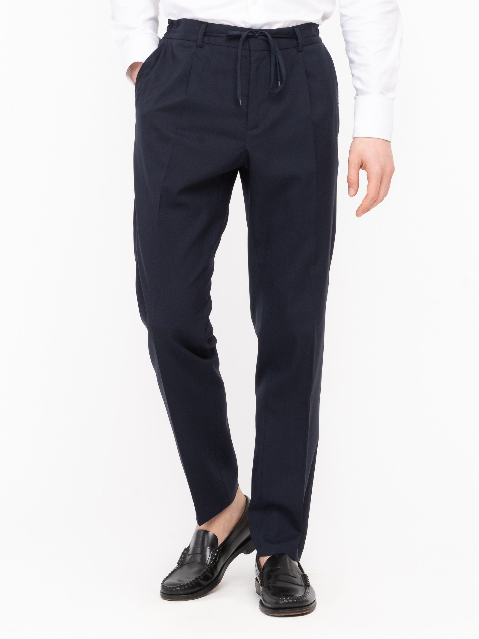 Pantalone jogging con una pinces, vestibilità regular, due tasche america frontali e due a doppio filetto con bottone sul retro, elastico ai fianchi, chiusura con coulisse, zip e gancio, fondo 18 cm. Tela in pura lana stretch