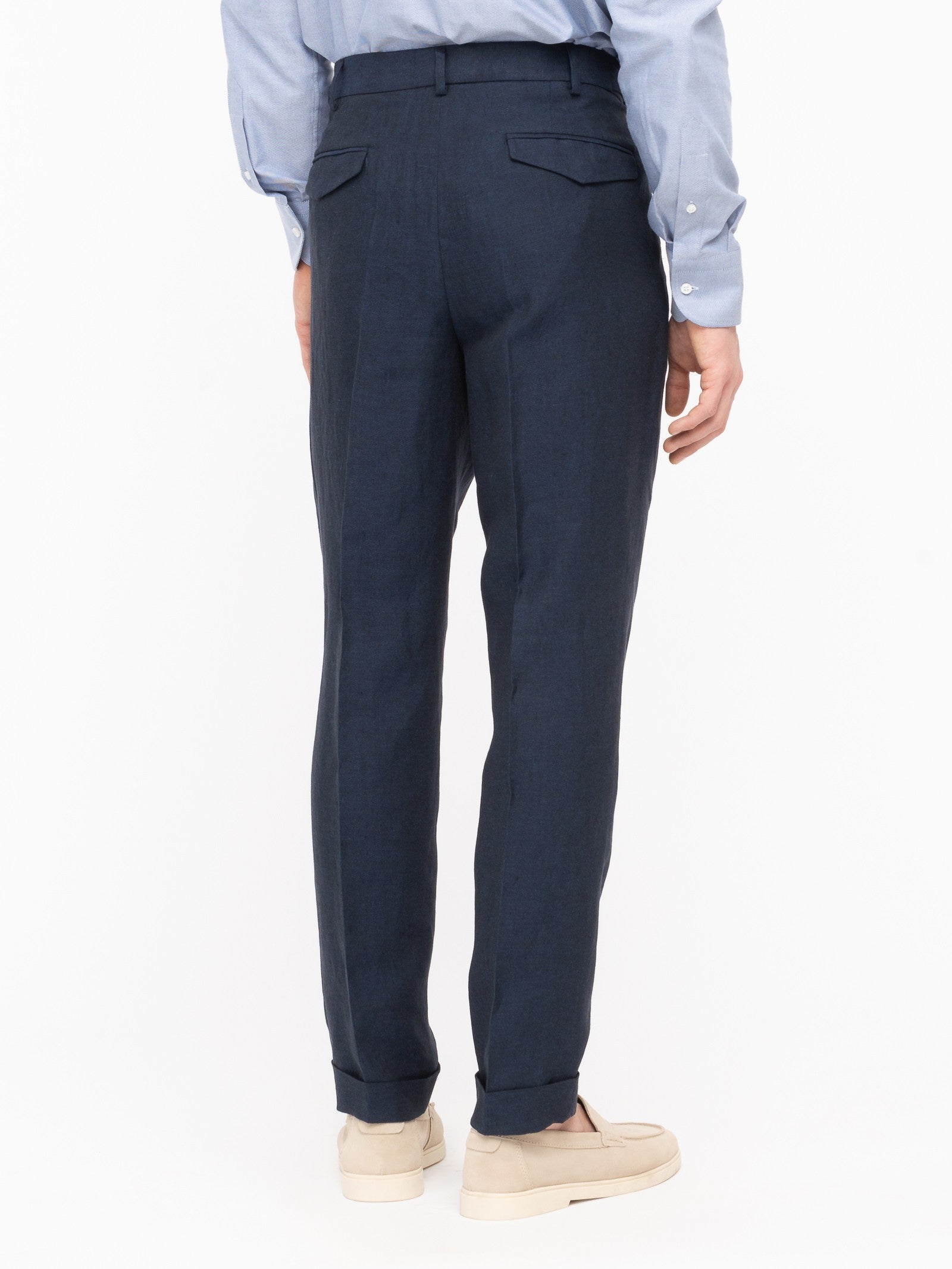 Pantalone a una pinces regular fit, due tasche america frontali, due tasche con pattina posteriori, passanti in tono, regolatori laterali, chiusura con zip, gancio e bottone, fondo 17,5 cm con risvolto. Tela in puro lino