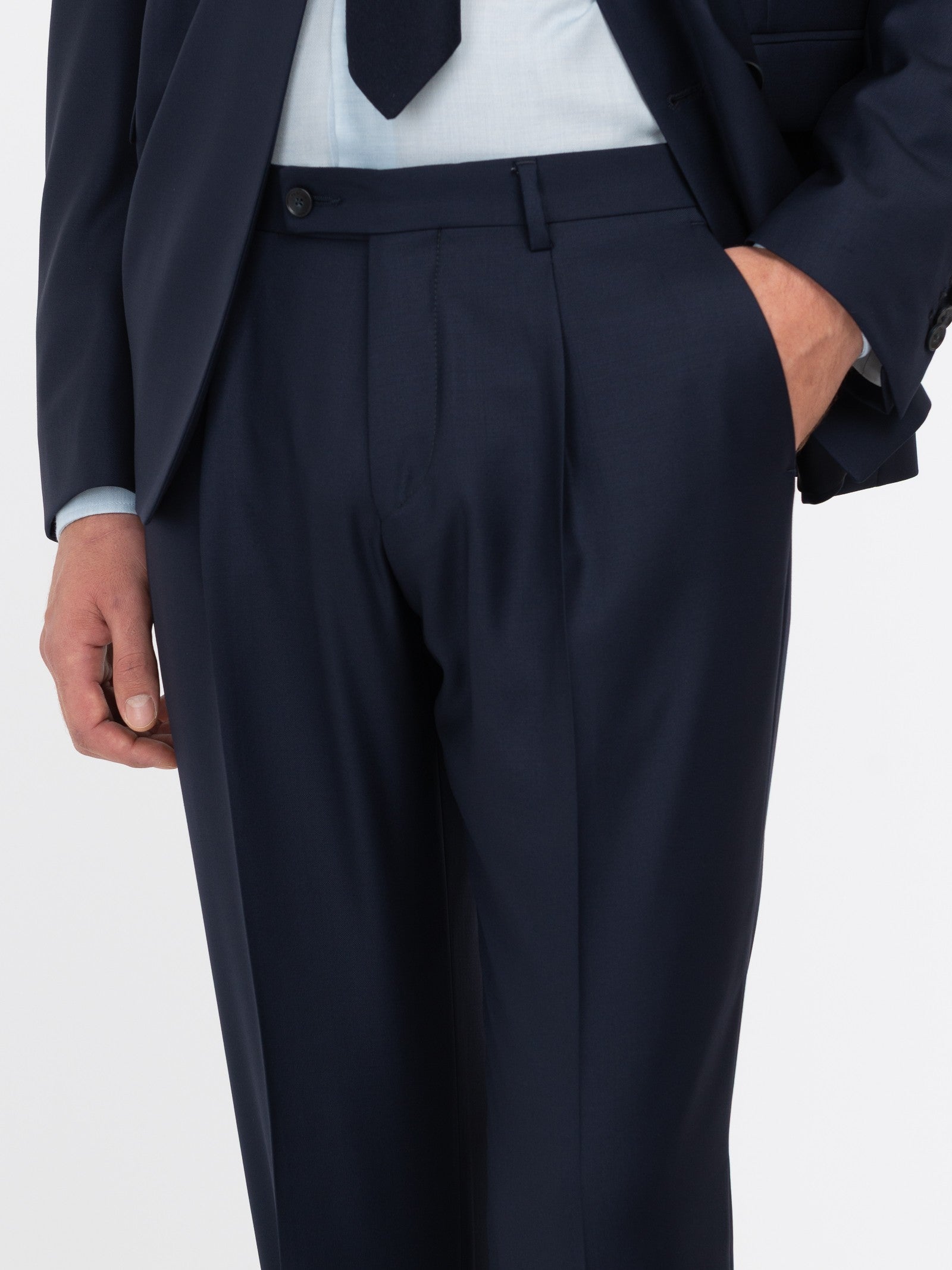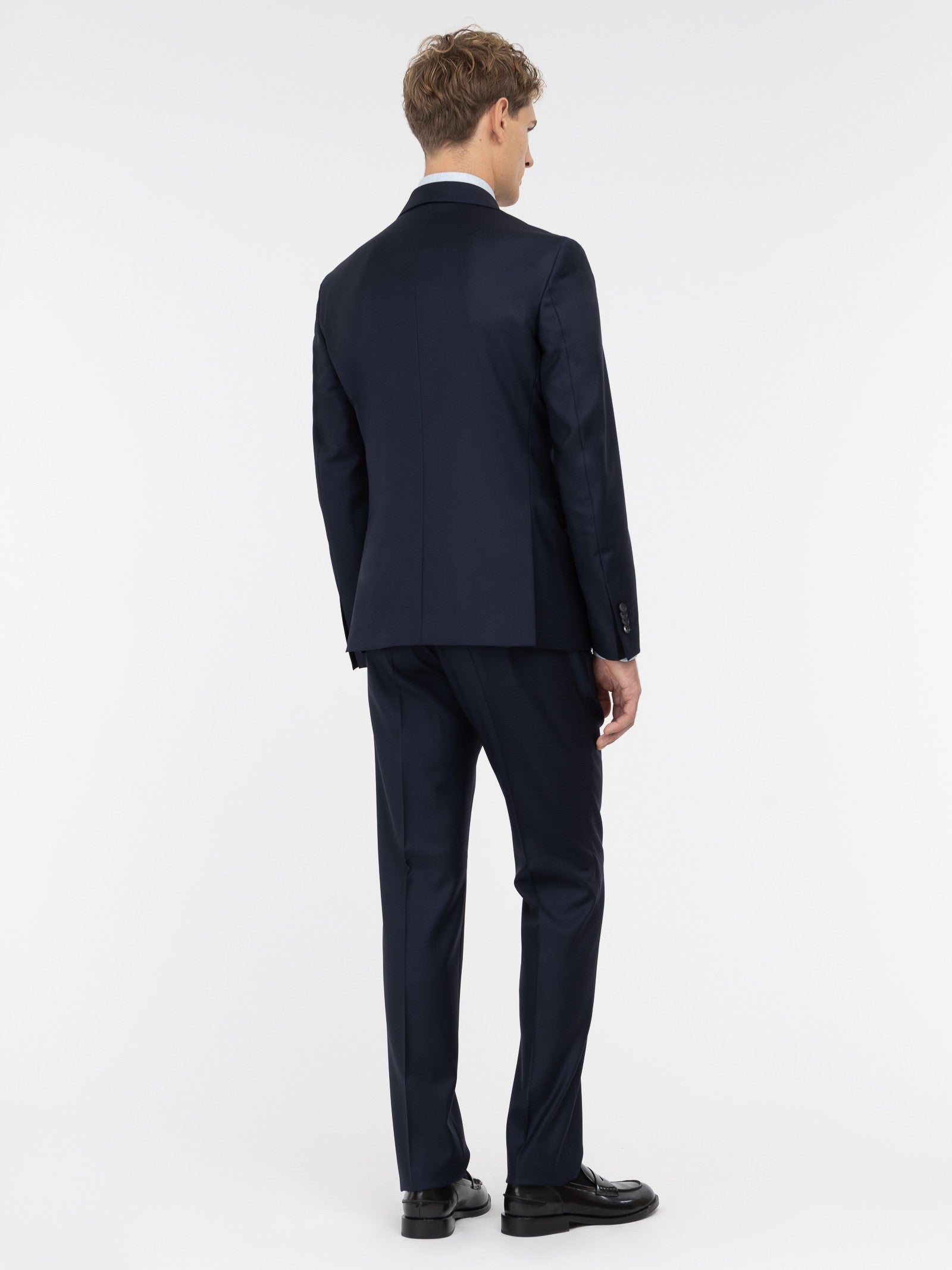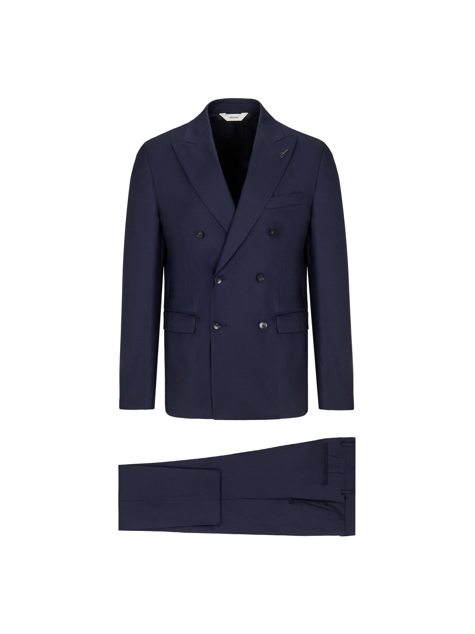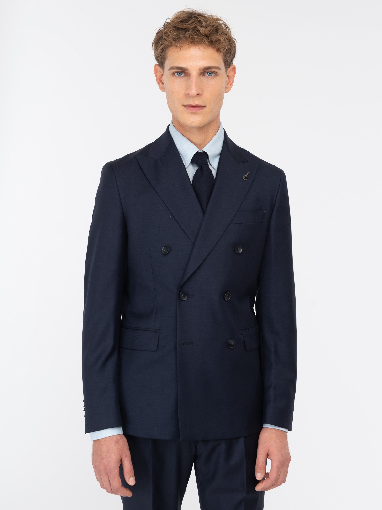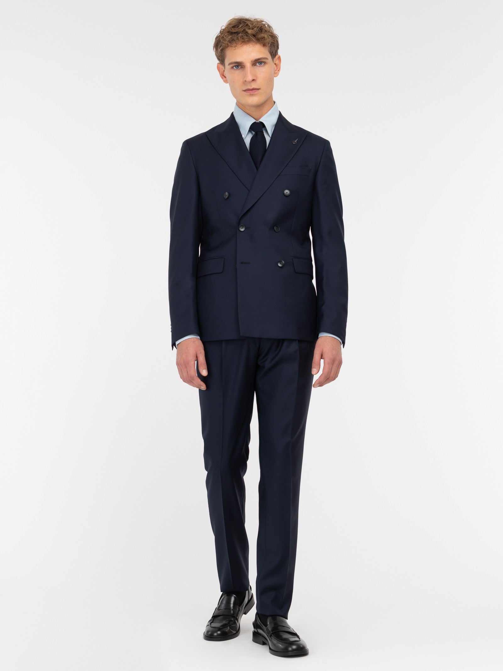 Abito doppiopetto foderato vestibilità asciutta base "Young". Giacca: ampio rever a lancia, due tasche a pattina e un taschino frontali, spacchi laterali sul retro, quattro bottoni ai polsi. Pantalone: una pinces, due tasche america davanti e due a filo sul retro, chiusura con zip, gancio e bottone, fondo 17,5 cm. Saglia in pura lana vergine