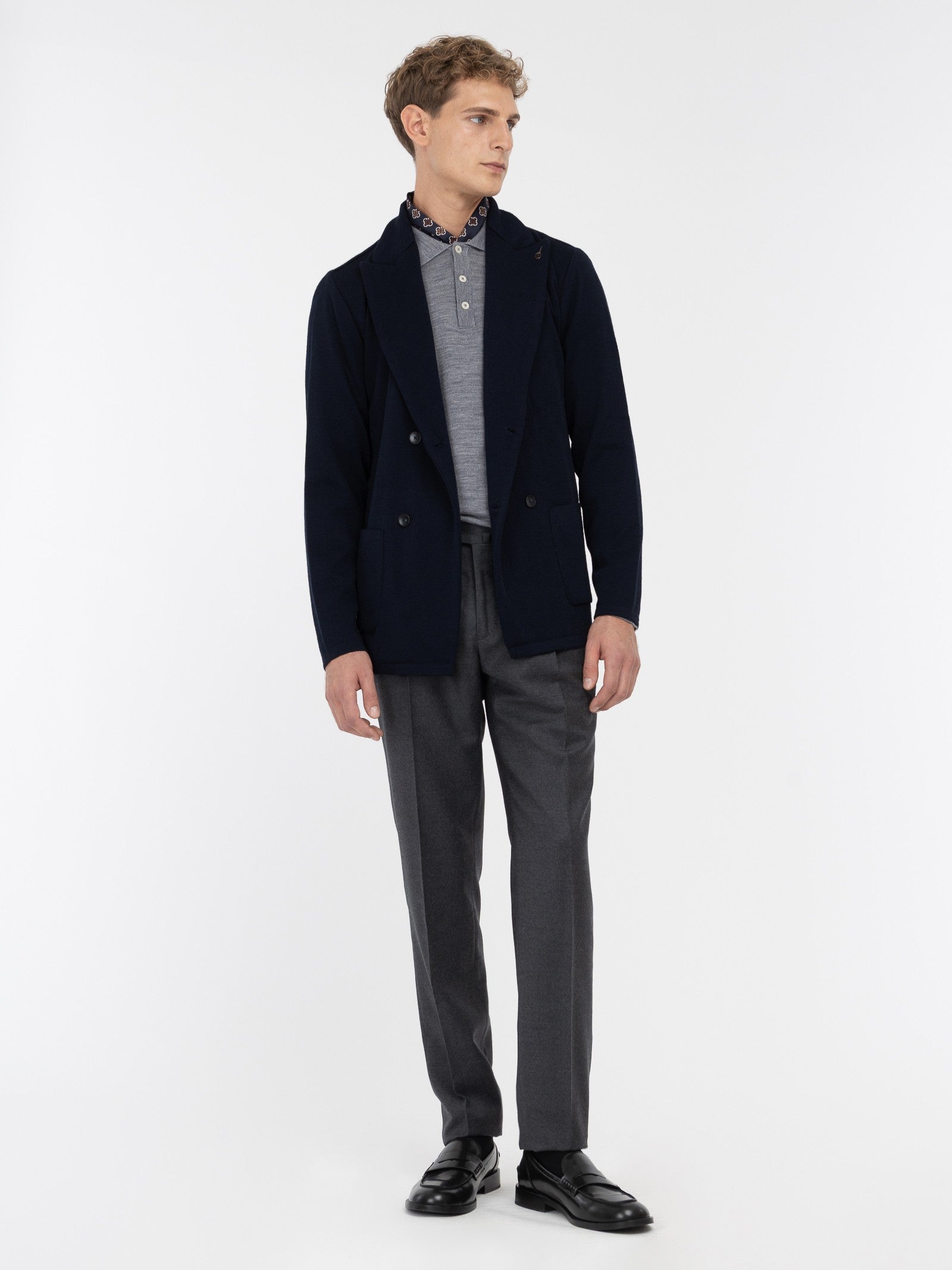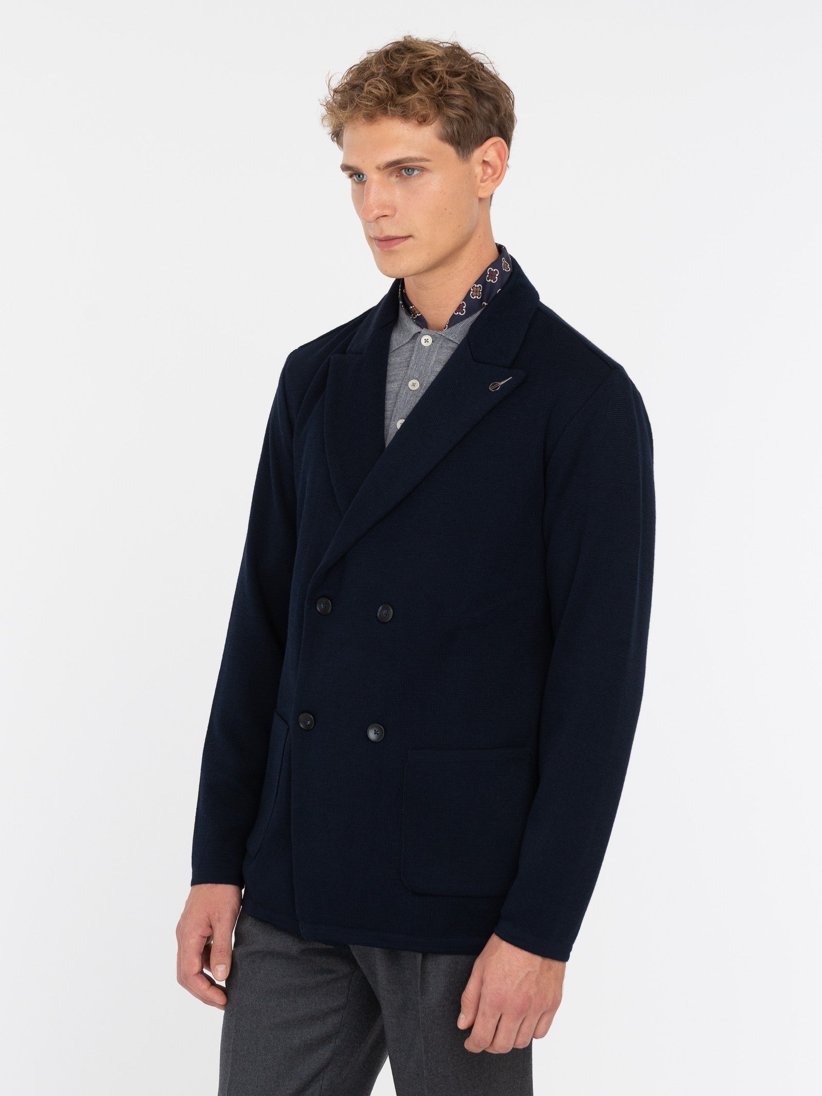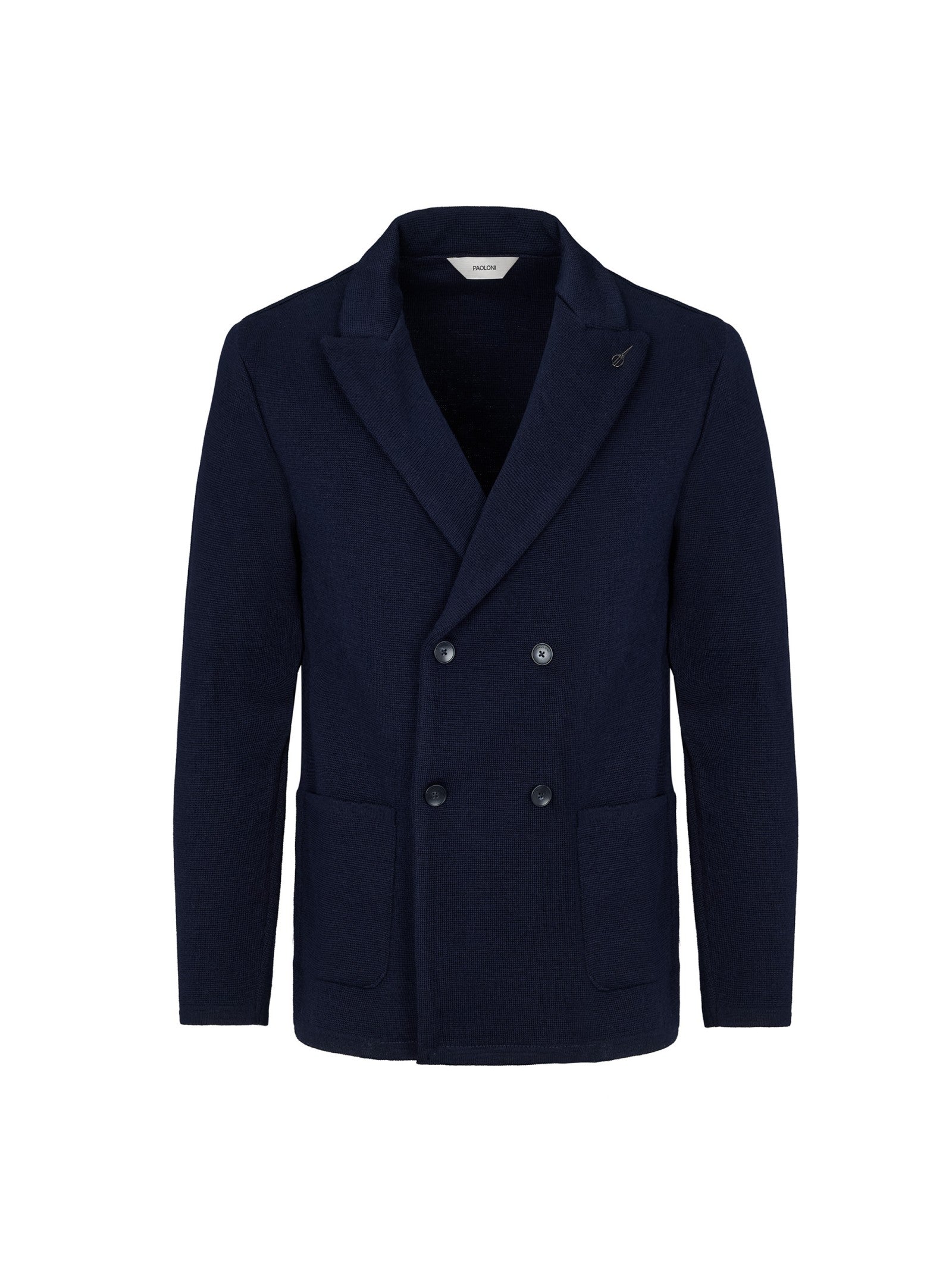 DESCRIZIONEGiacca maglia doppiopetto, ampio rever a lancia, due tasche a toppa frontali. Jersey punto piquet misto lana