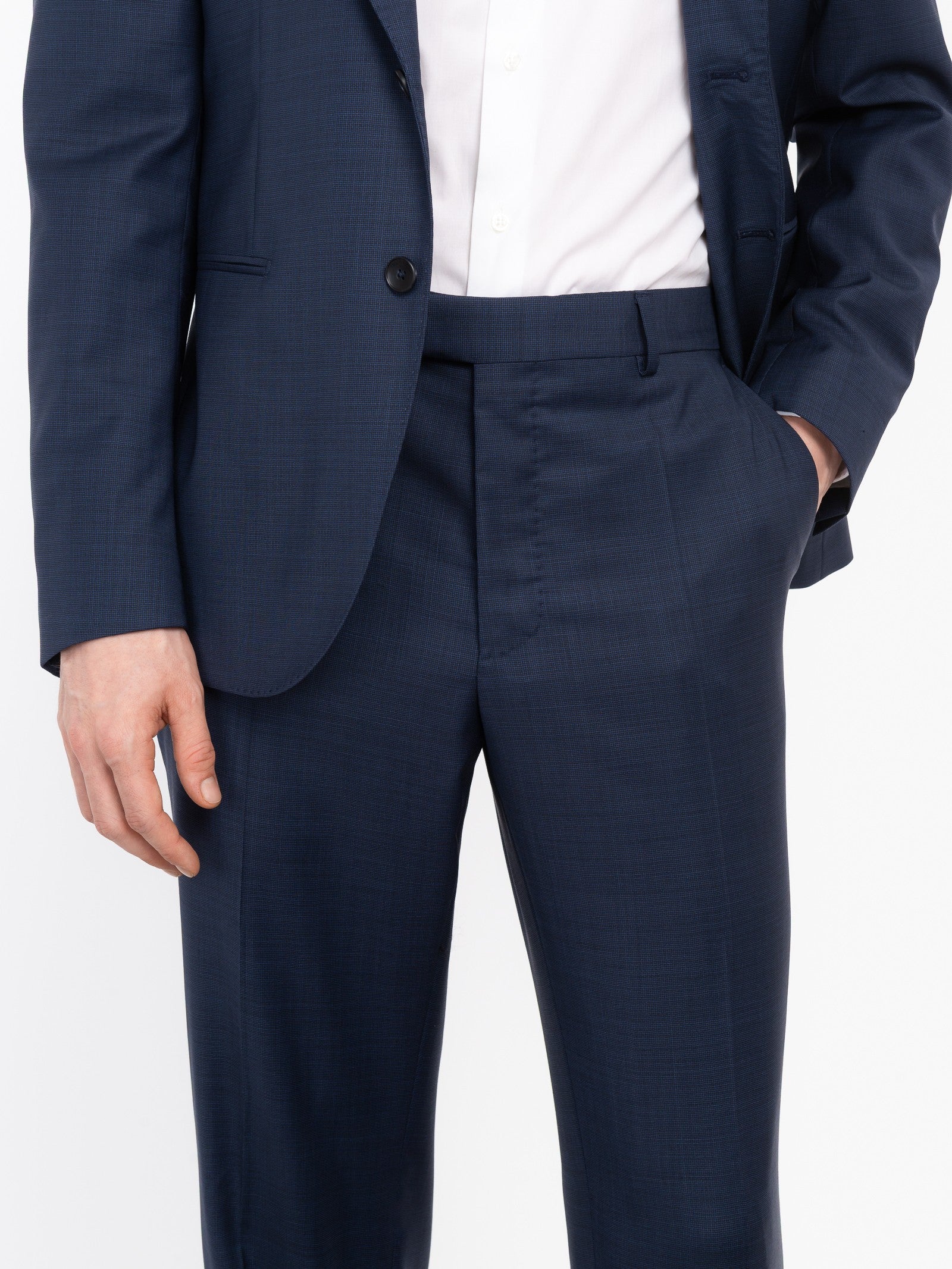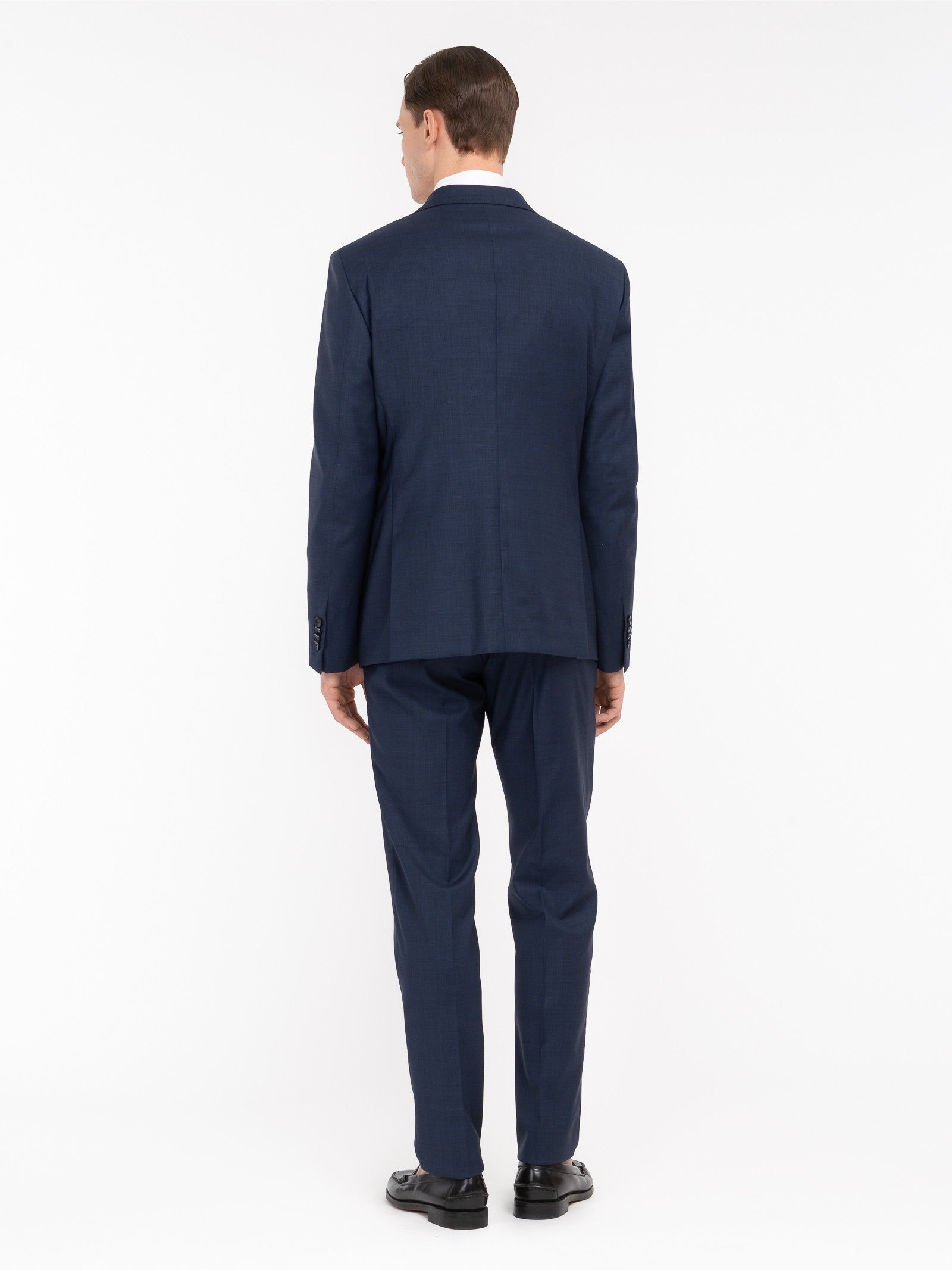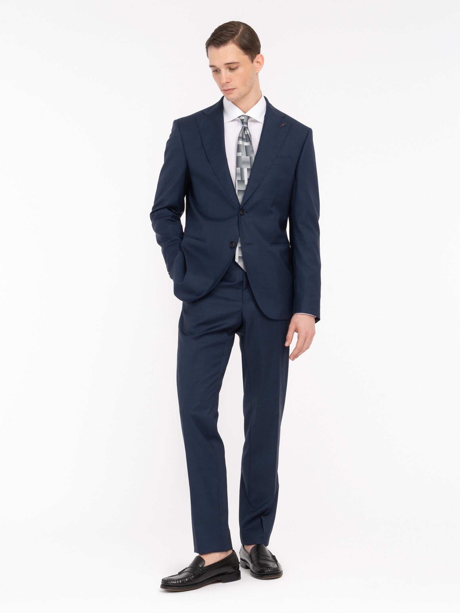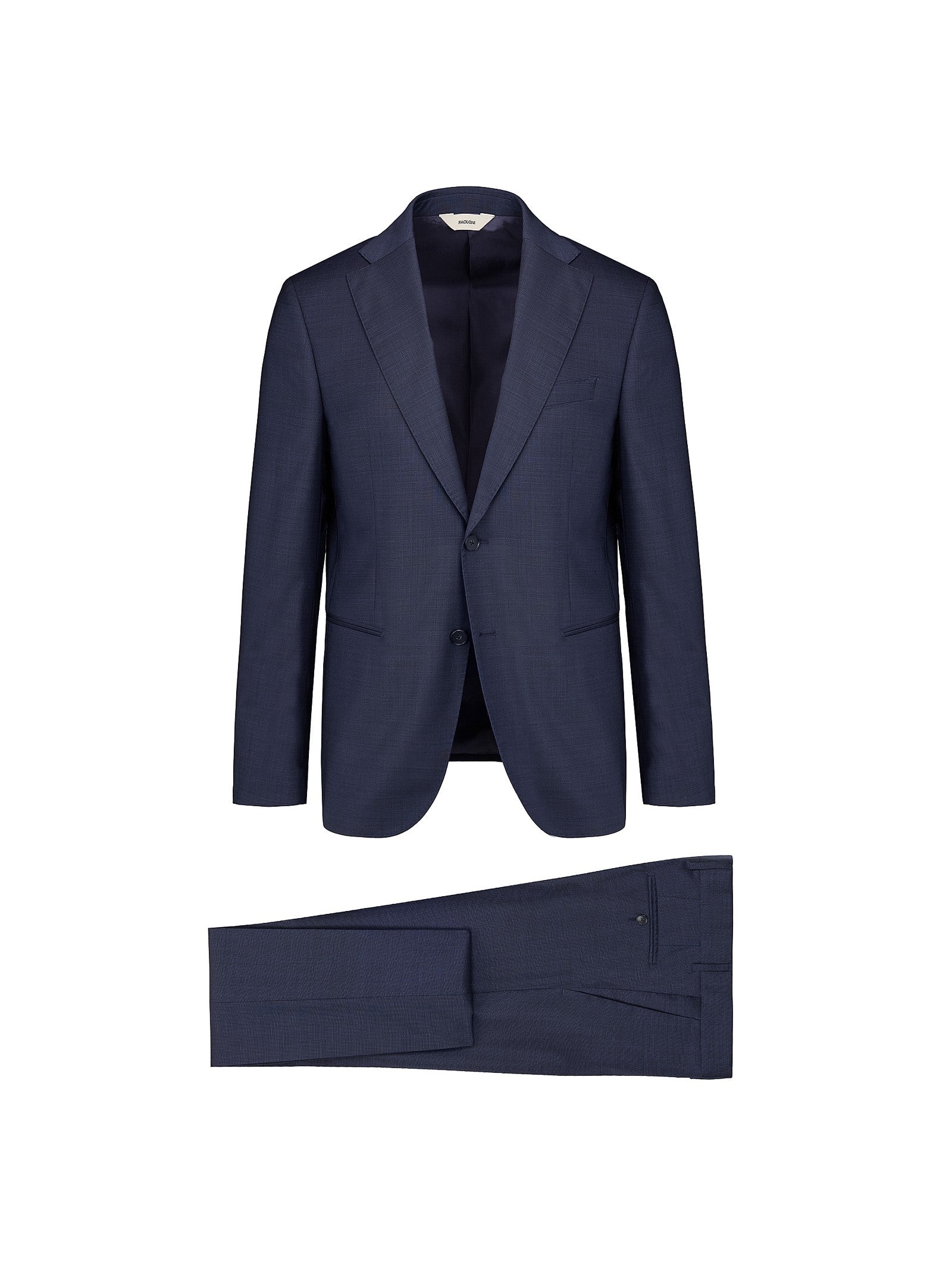 Abito foderato vestibilità asciutta base "Young". Giacca: chiusura due bottoni, due tasche a pattina e un taschino frontali, spacchi laterali sul retro, quattro bottoni ai polsi. Pantalone: due tasche america e due a filo con bottone sul retro, passanti in vita, chiusura con zip, gancio e bottone, fondo 17,5 cm. Micro texture lana vergine super 100's
