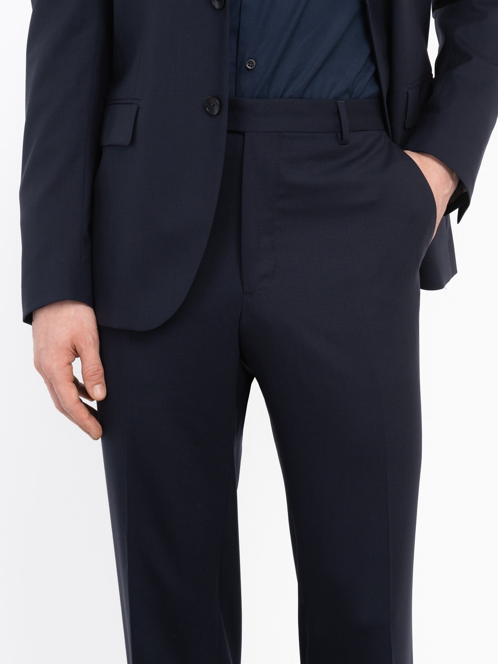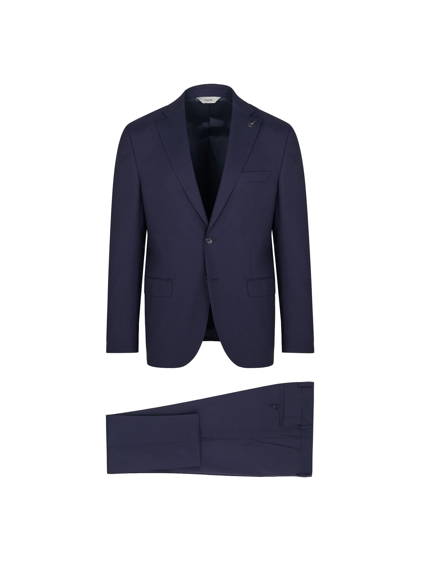 Abito foderato drop 7 base "slim". Giacca: chiusura due bottoni, due tasche a pattina e un taschino frontali, quattro bottoni ai polsi, spacchi laterali sul retro. Pantalone: due tasche america davanti e due a filo con bottone sul retro, chiusura con zip, gancio e bottone, fondo 18 cm. Tela in pura lana stretch