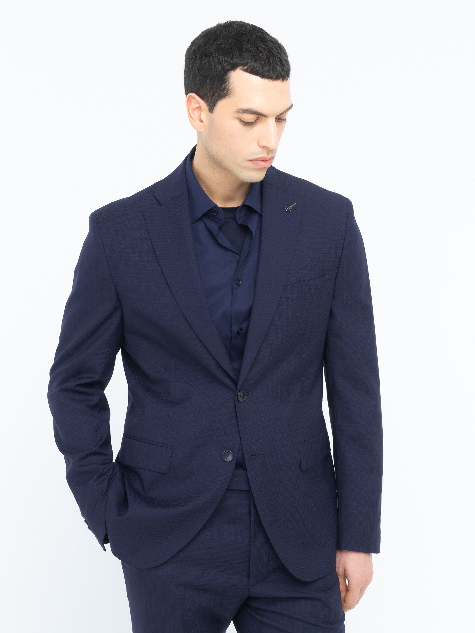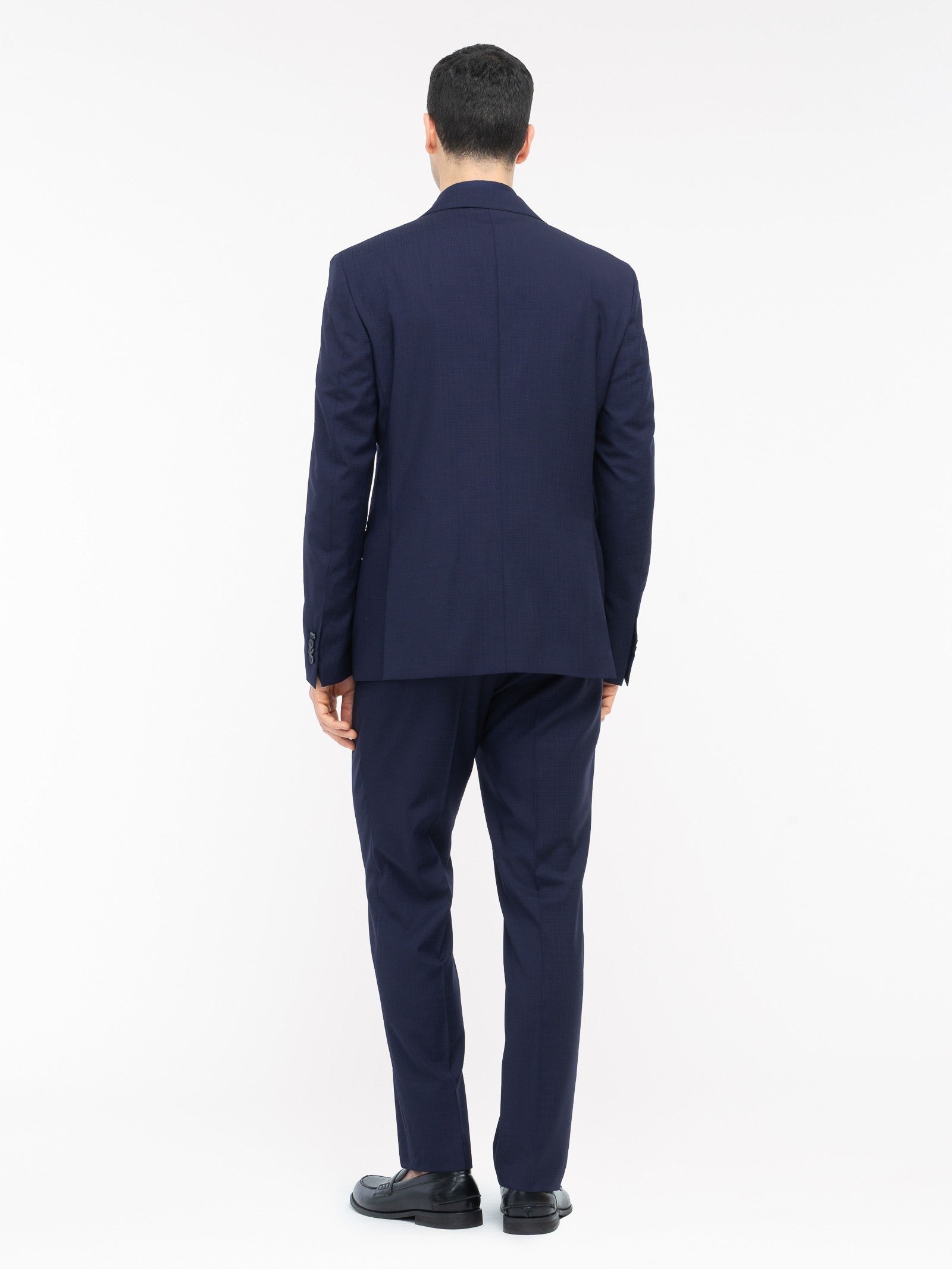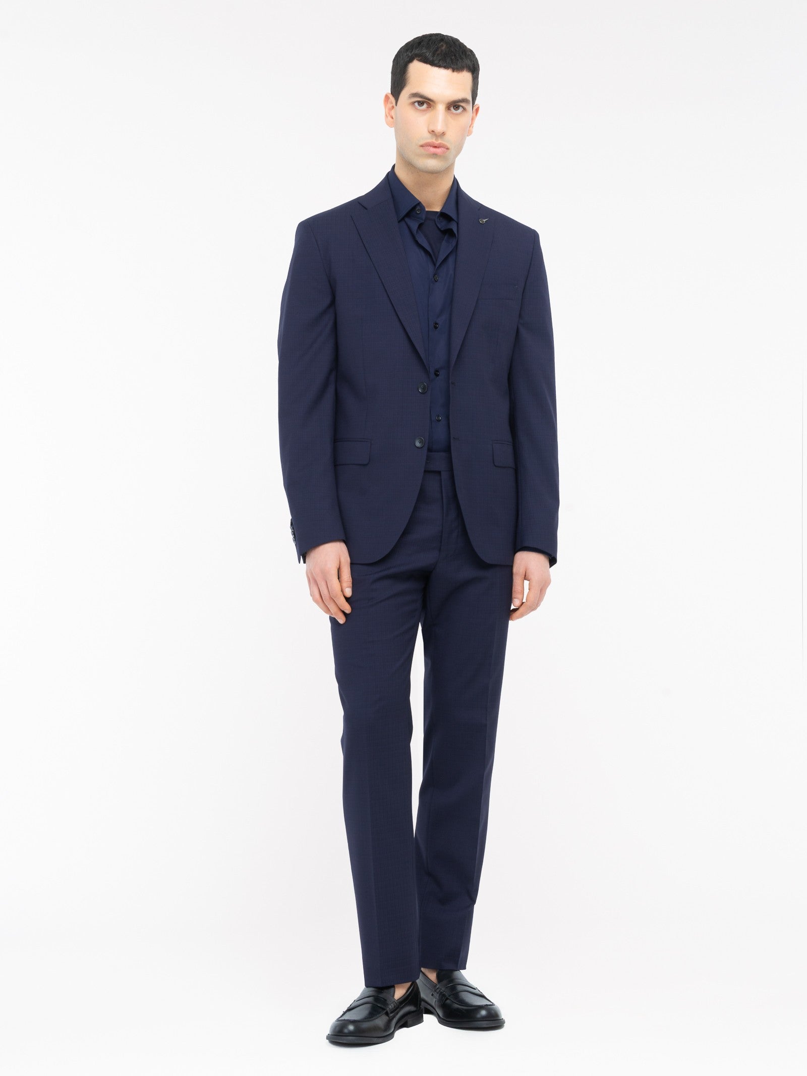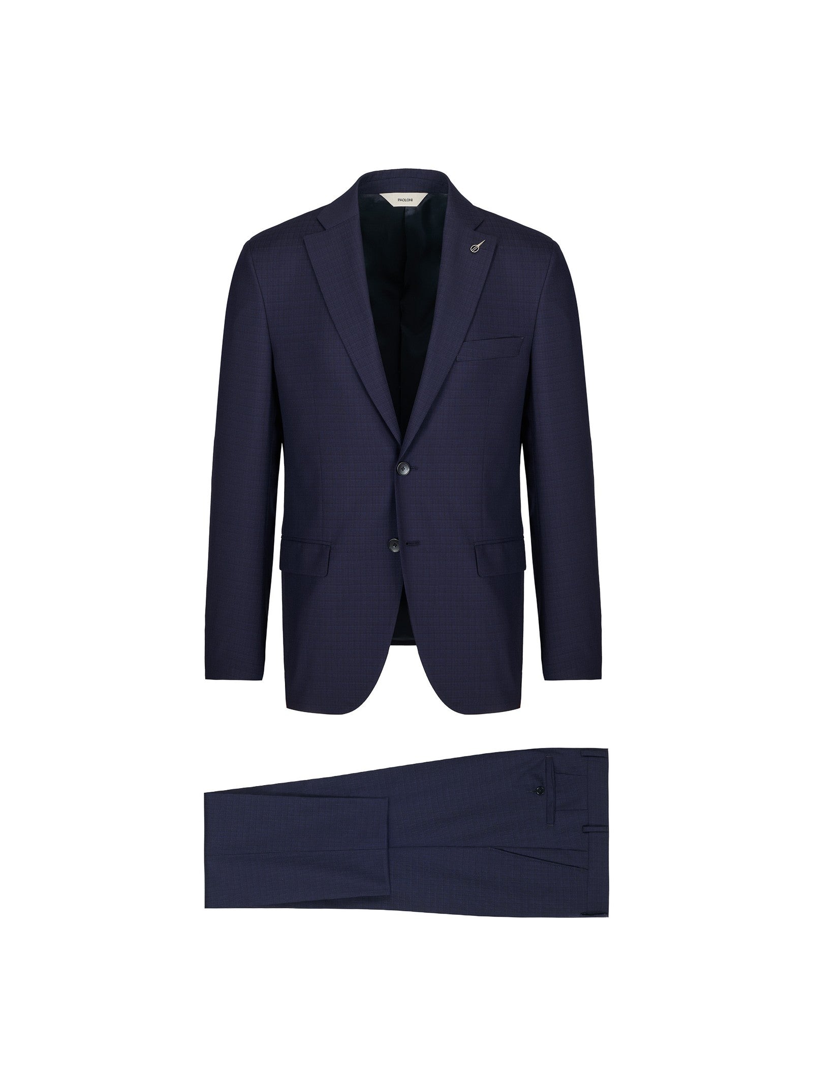 Abito foderato drop 7 base "slim". Giacca: chiusura due bottoni, due tasche a pattina e un taschino frontali, quattro bottoni ai polsi, spacchi laterali sul retro. Pantalone: due tasche america davanti e due a filo con bottone sul retro, chiusura con zip, gancio e bottone, fondo 18 cm. Micro check lana vergine super 110's