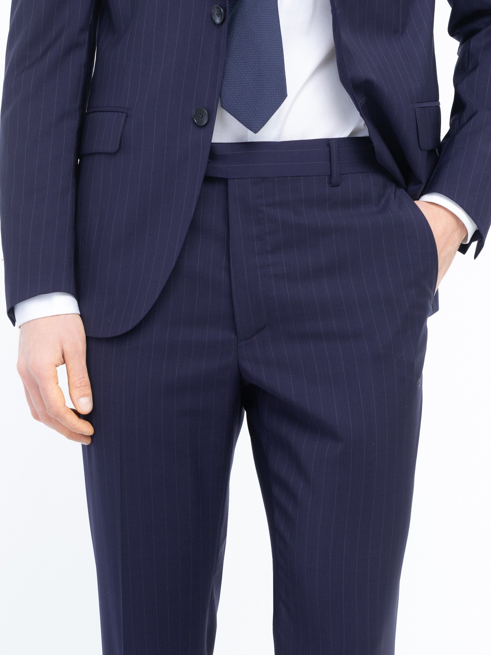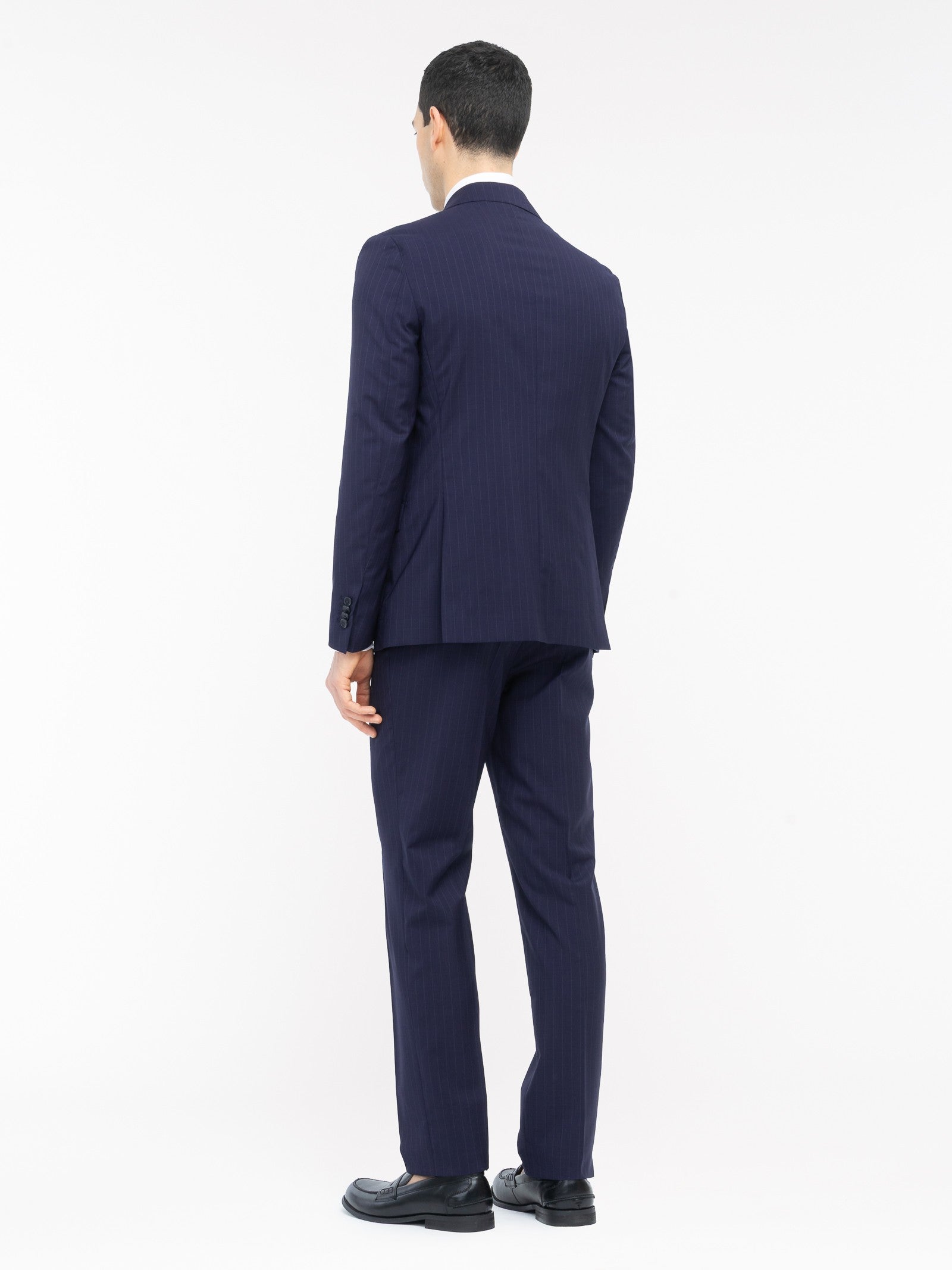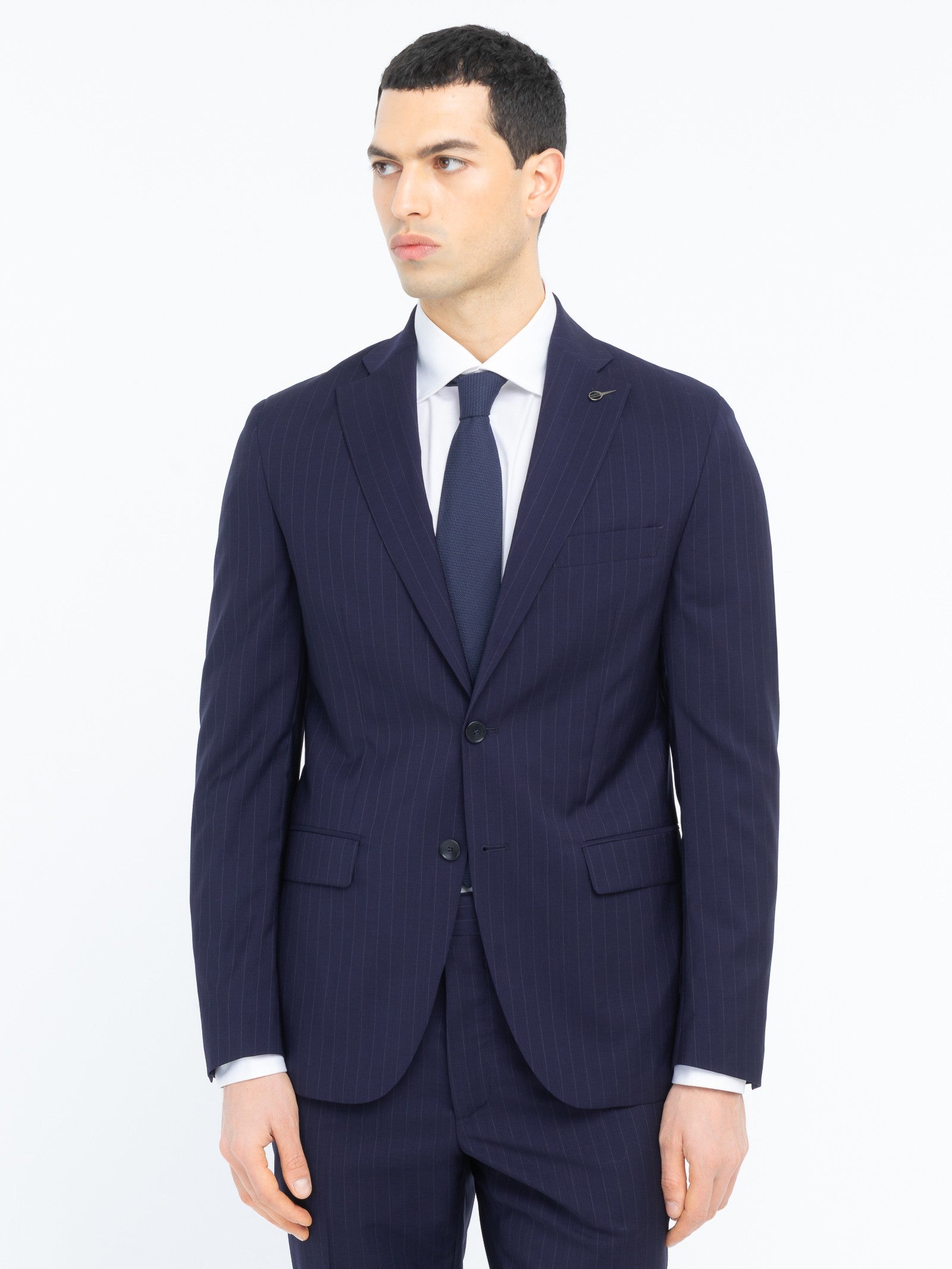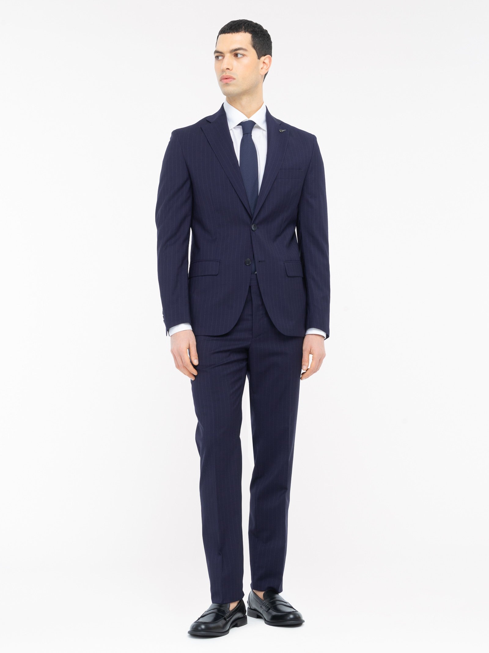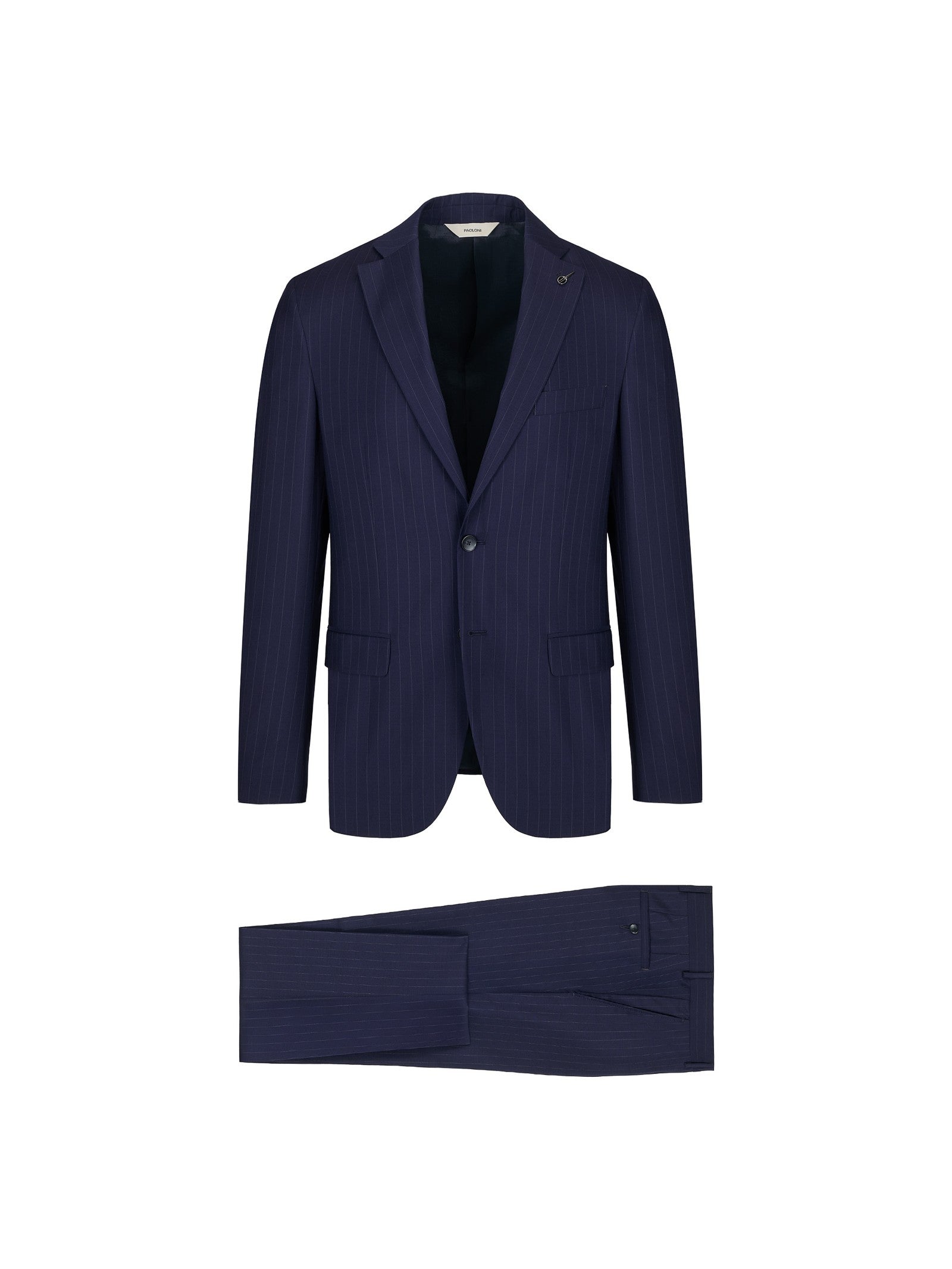Abito foderato drop 7 base "slim". Giacca: chiusura due bottoni, due tasche a pattina e un taschino frontali, quattro bottoni ai polsi, spacchi laterali sul retro. Pantalone: due tasche america davanti e due a filo con bottone sul retro, chiusura con zip, gancio e bottone, fondo 18 cm. Gessato in lana vergine super 100's