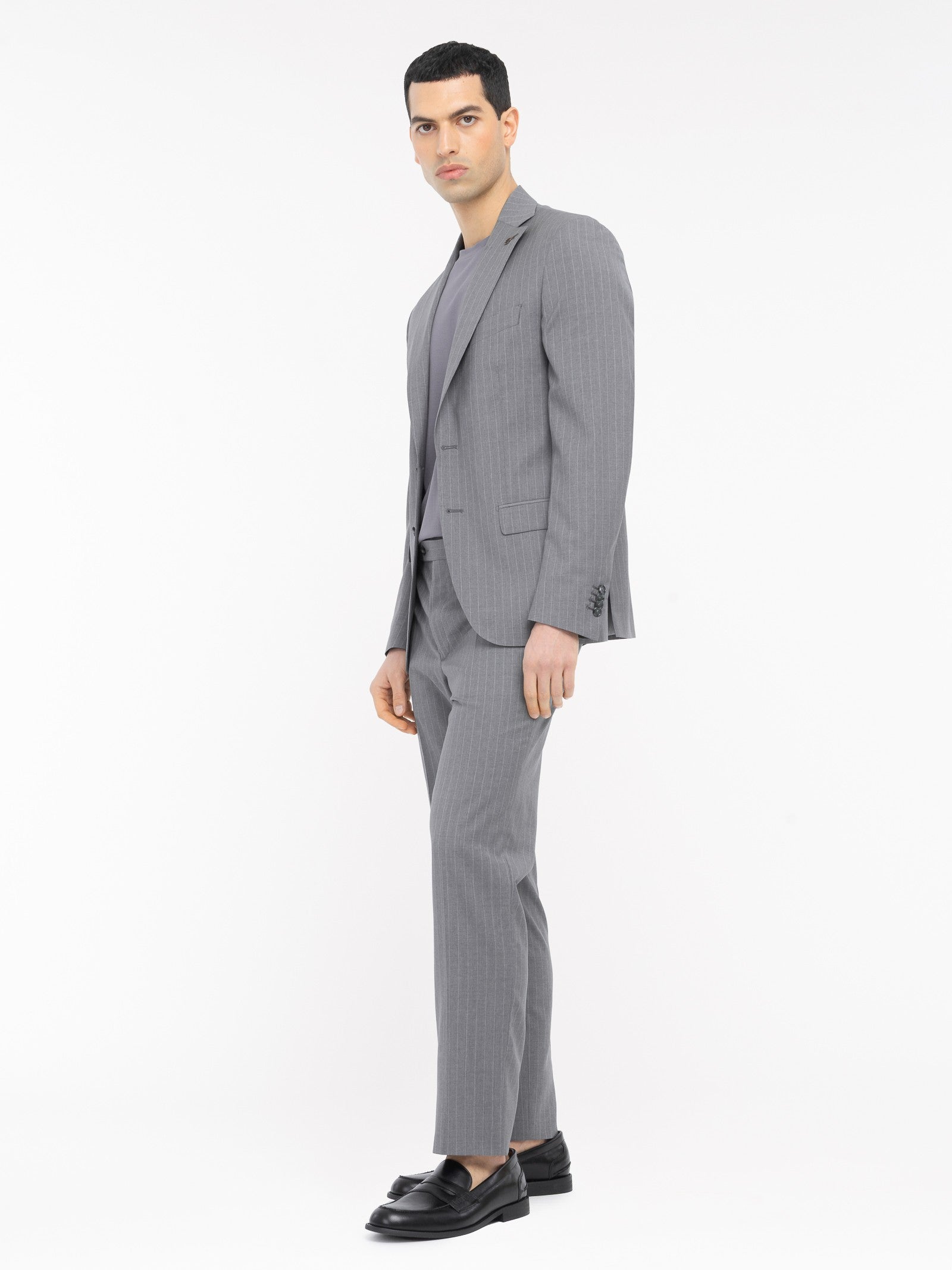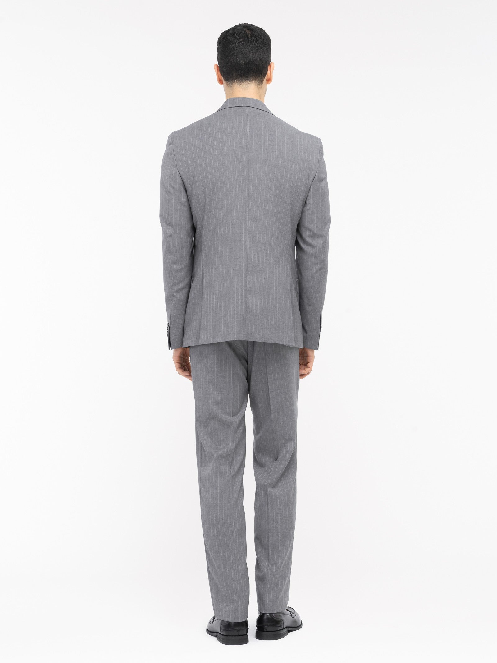 Abito foderato drop 7 base "slim". Giacca: chiusura due bottoni, due tasche a pattina e un taschino frontali, quattro bottoni ai polsi, spacchi laterali sul retro. Pantalone: due tasche america davanti e due a filo con bottone sul retro, chiusura con zip, gancio e bottone, fondo 18 cm. Gessato in lana vergine super 100's