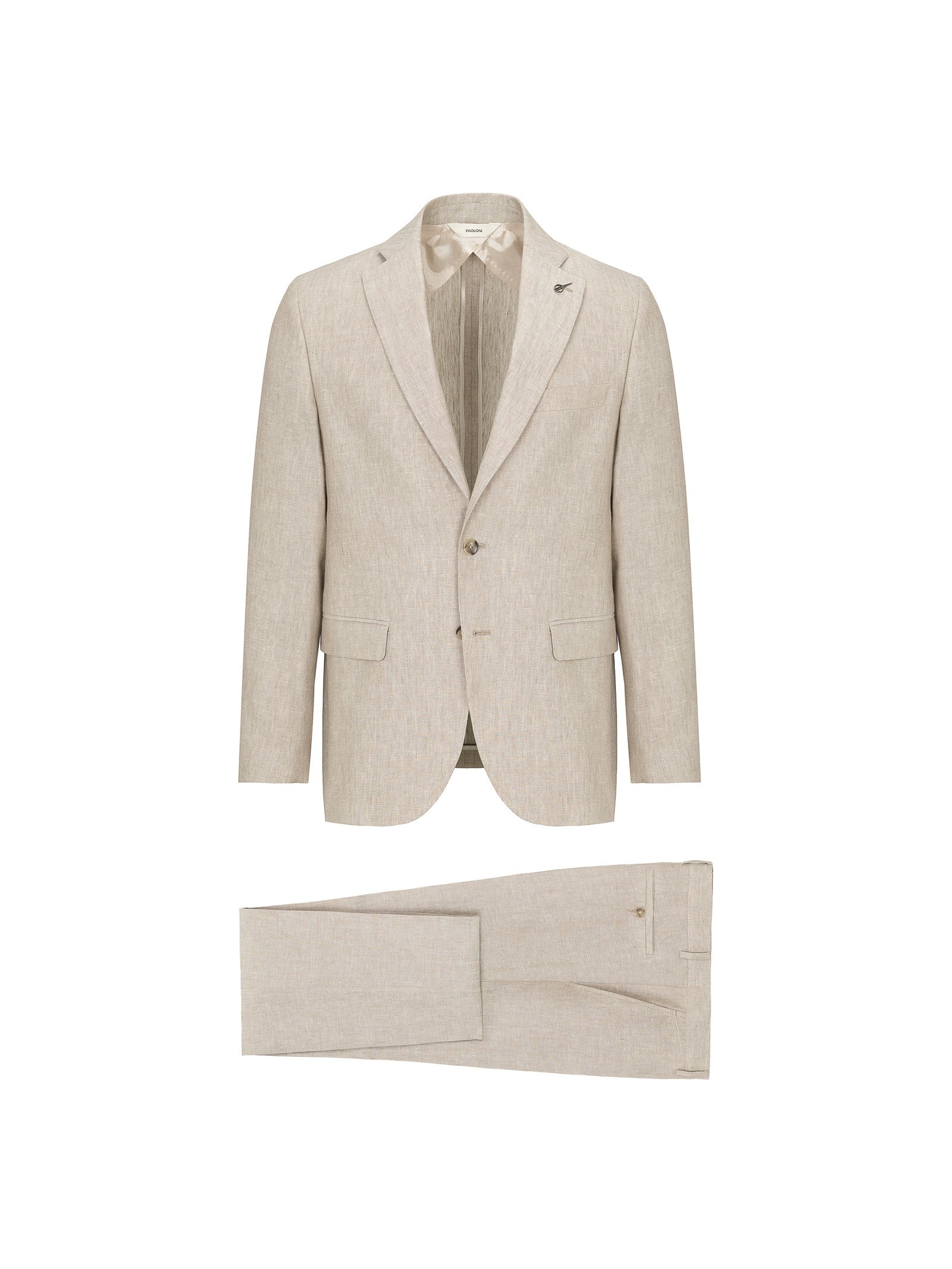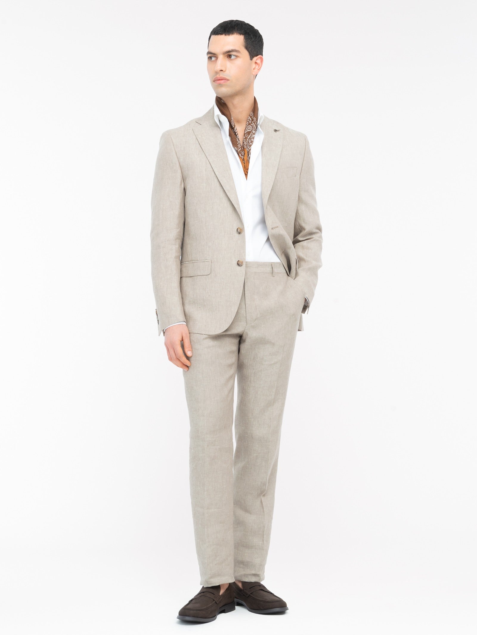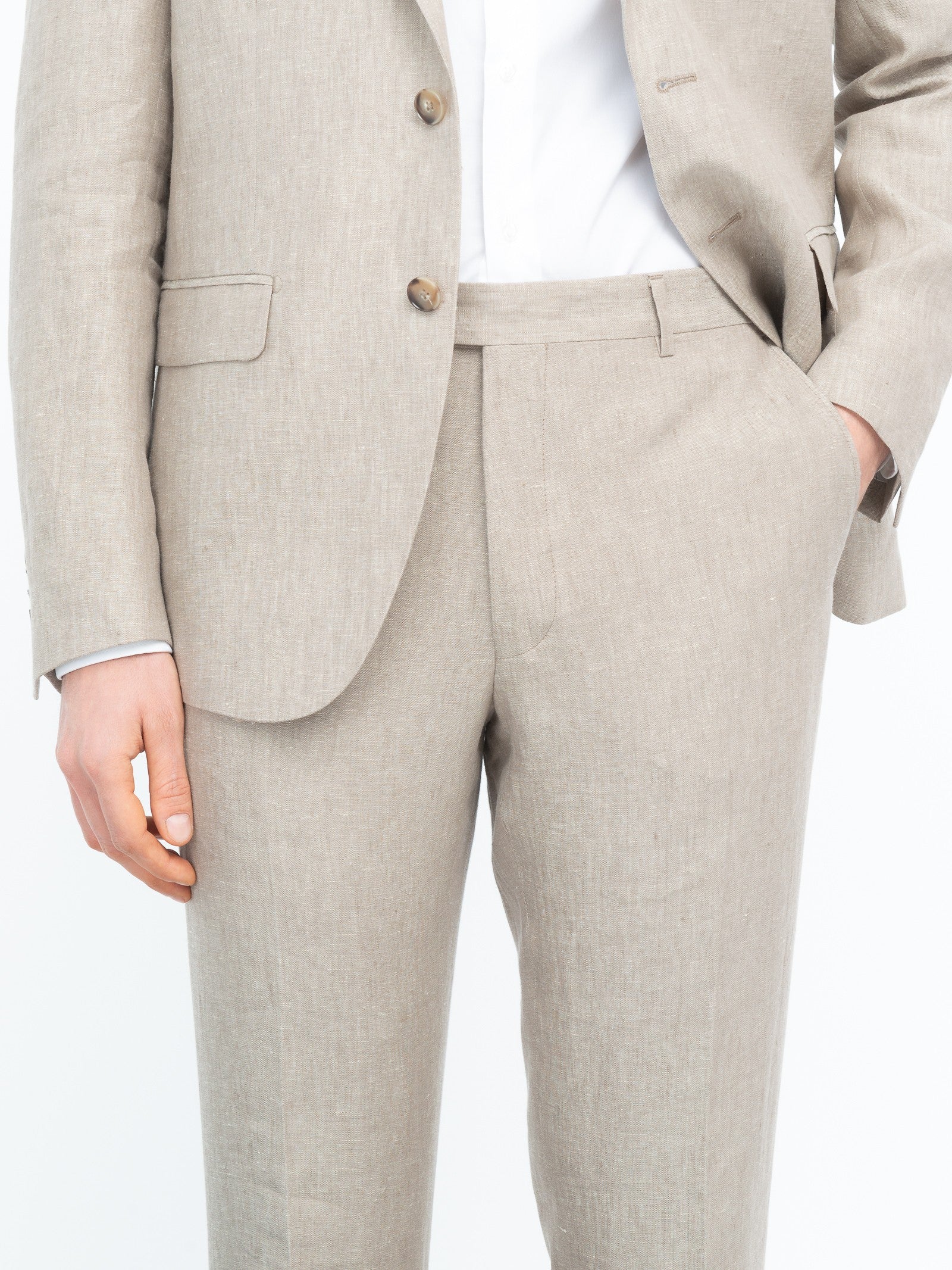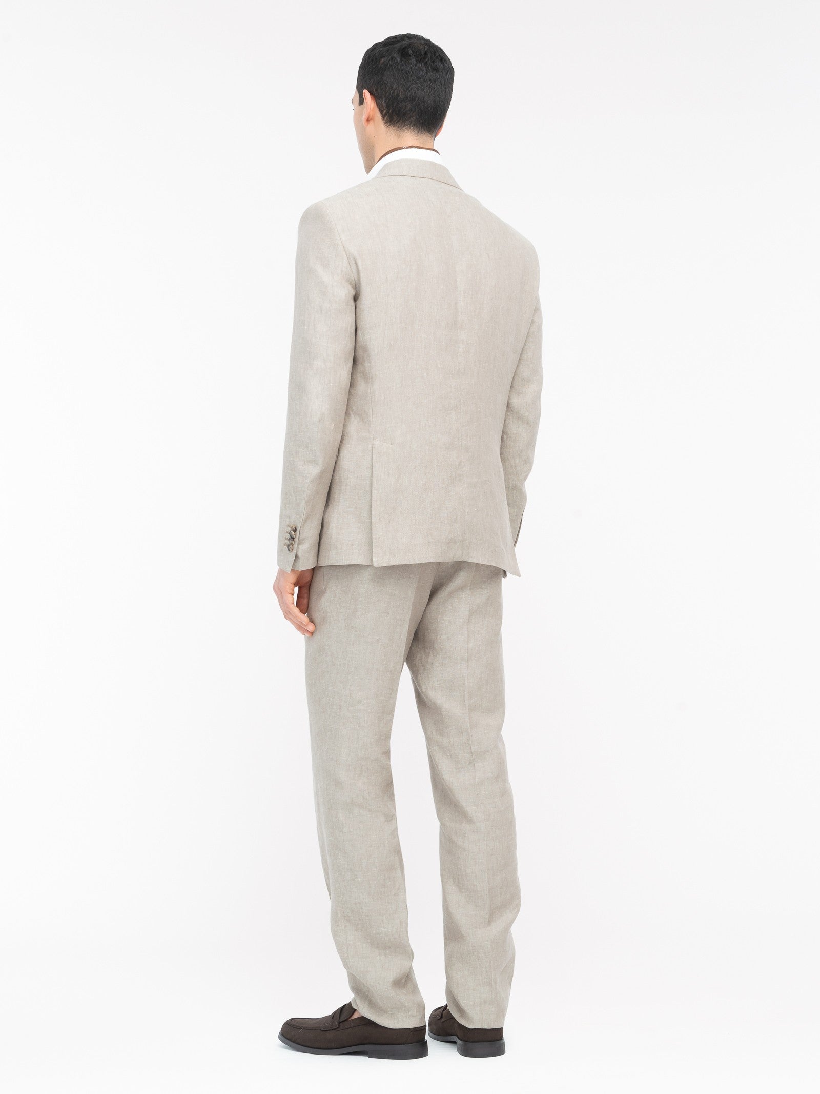 Abito semifoderato drop 7 base "slim". Giacca: chiusura due bottoni, due tasche a pattina e un taschino frontali, quattro bottoni ai polsi, spacchi laterali sul retro. Pantalone: due tasche america davanti e due a filo con bottone sul retro, chiusura con zip, gancio e bottone, fondo 18 cm. Tela in puro lino