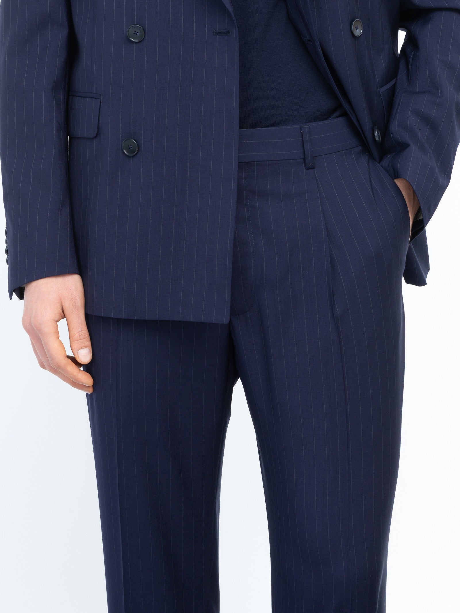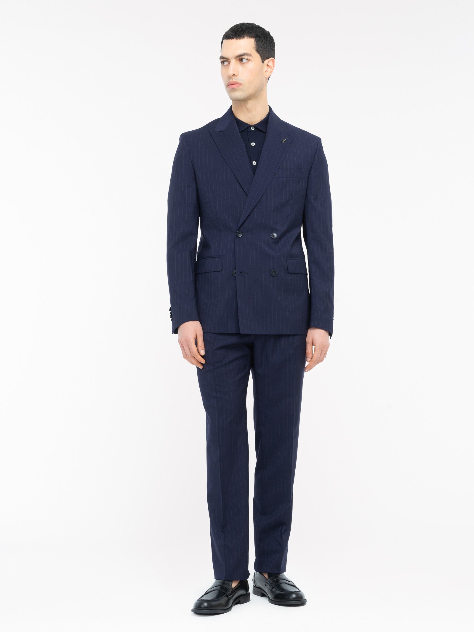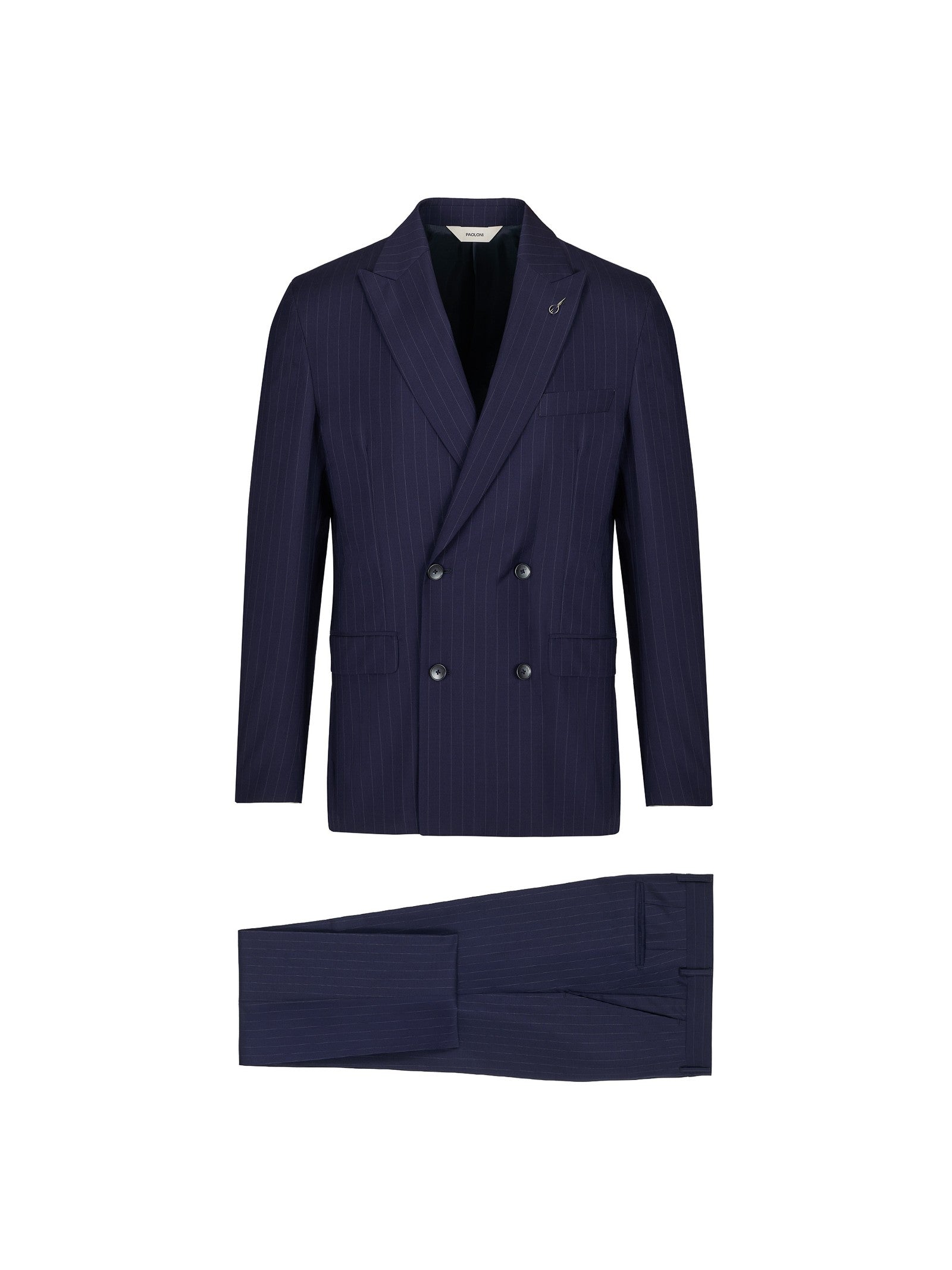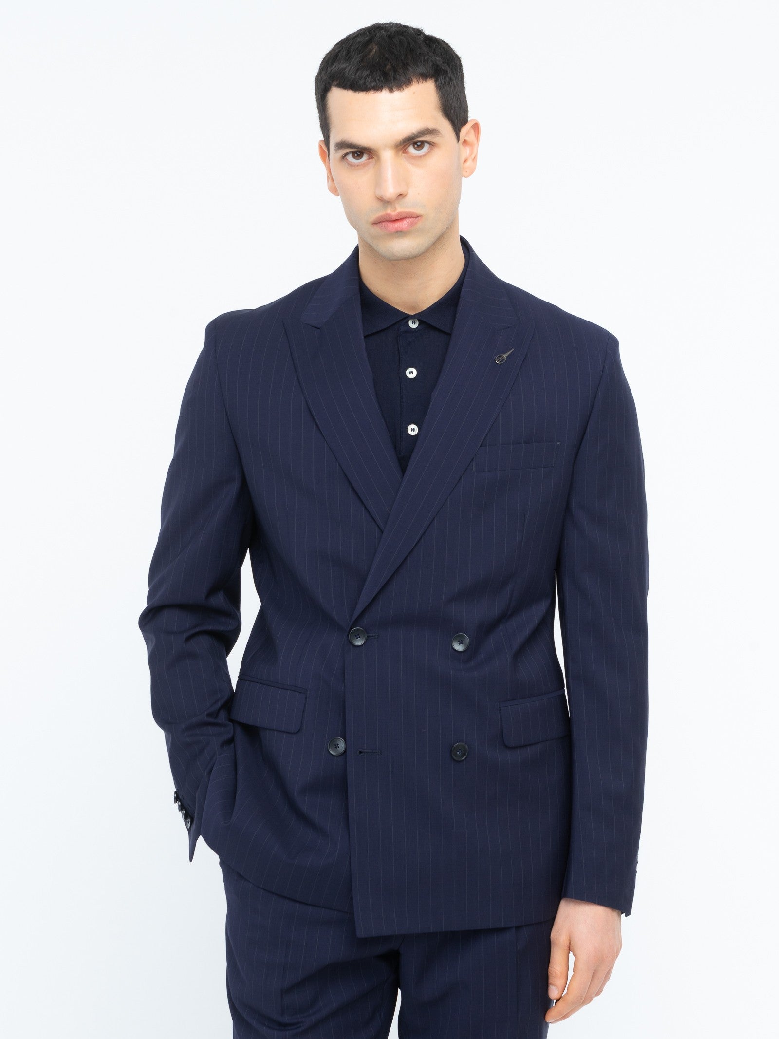 Abito doppiopetto foderato slim drop 7. Giacca: chiusura quattro bottoni, ampio rever a lancia, due tasche a pattina e un taschino frontali, spacchi laterali sul retro, quattro bottoni ai polsi. Pantalone: slim fit una pince, due tasche america frontali e due a filo sul retro, passanti in vita, chiusura con zip, gancio e bottone, fondo 17,5 cm. Gessato in lana vergine super 100's