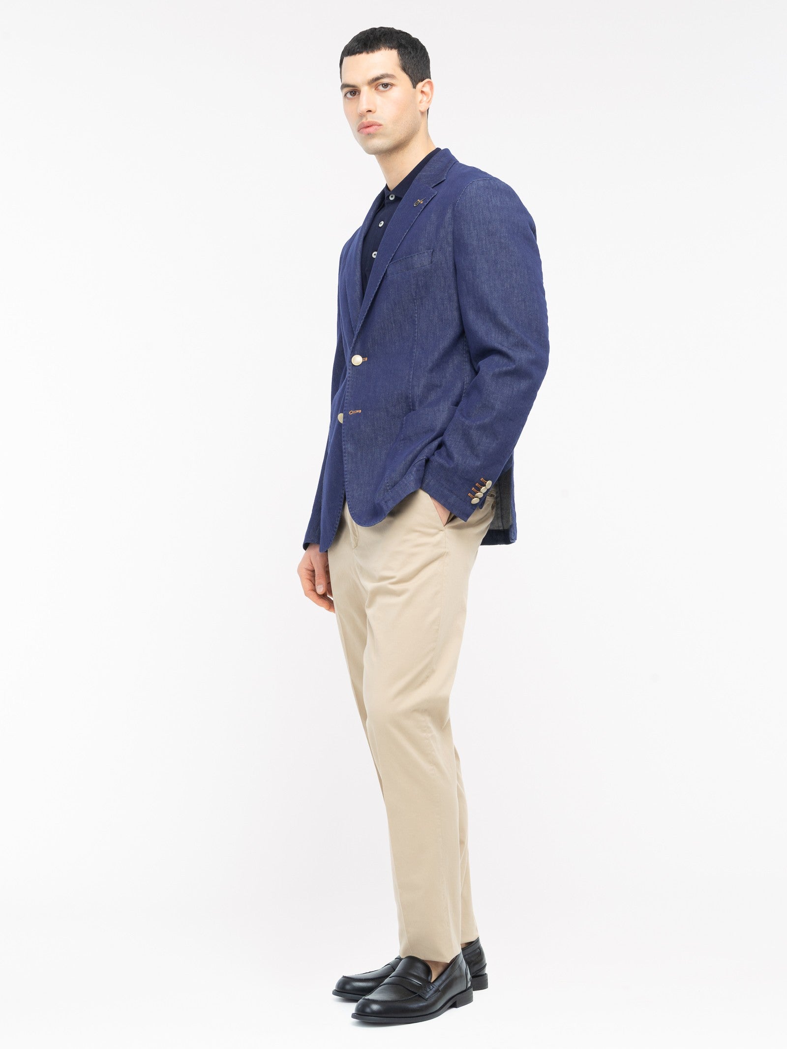Giacca sfoderata lavata, chiusura due bottoni in metallo, due tasche a toppa e un taschino frontali, quattro bottoni ai polsi, spacchi laterali sul retro, finiture con impunture. Twill di cotone stretch effetto denim