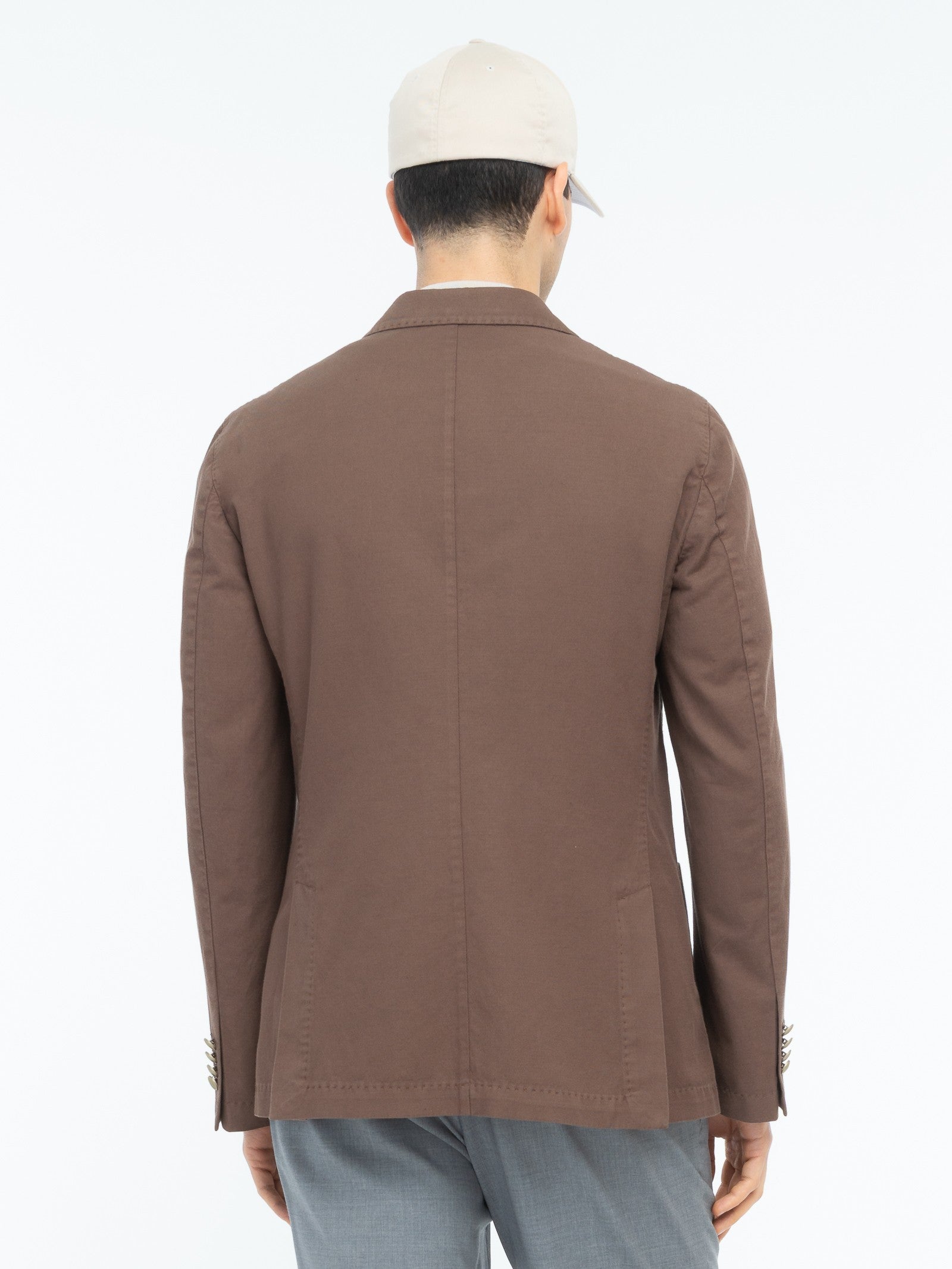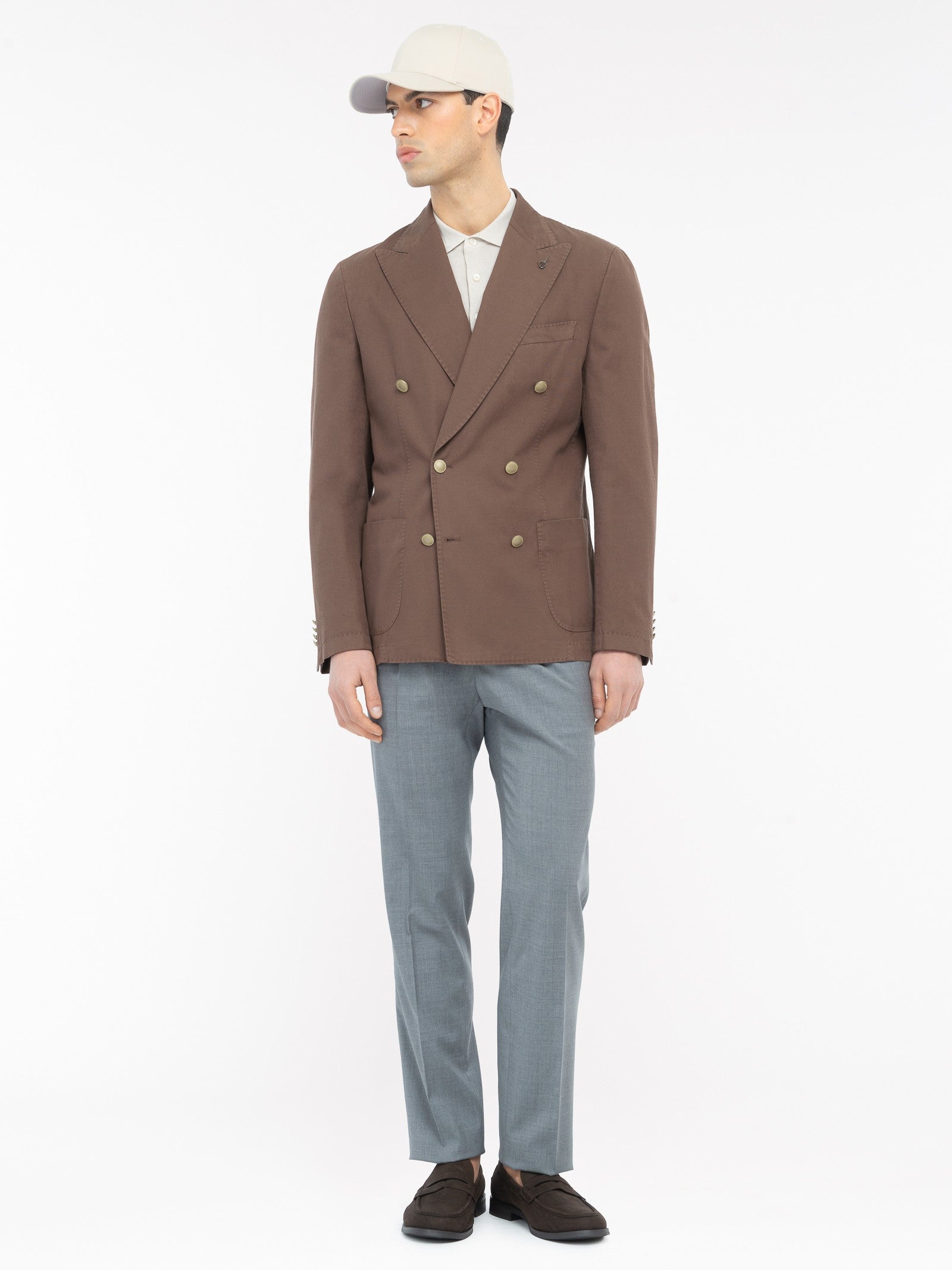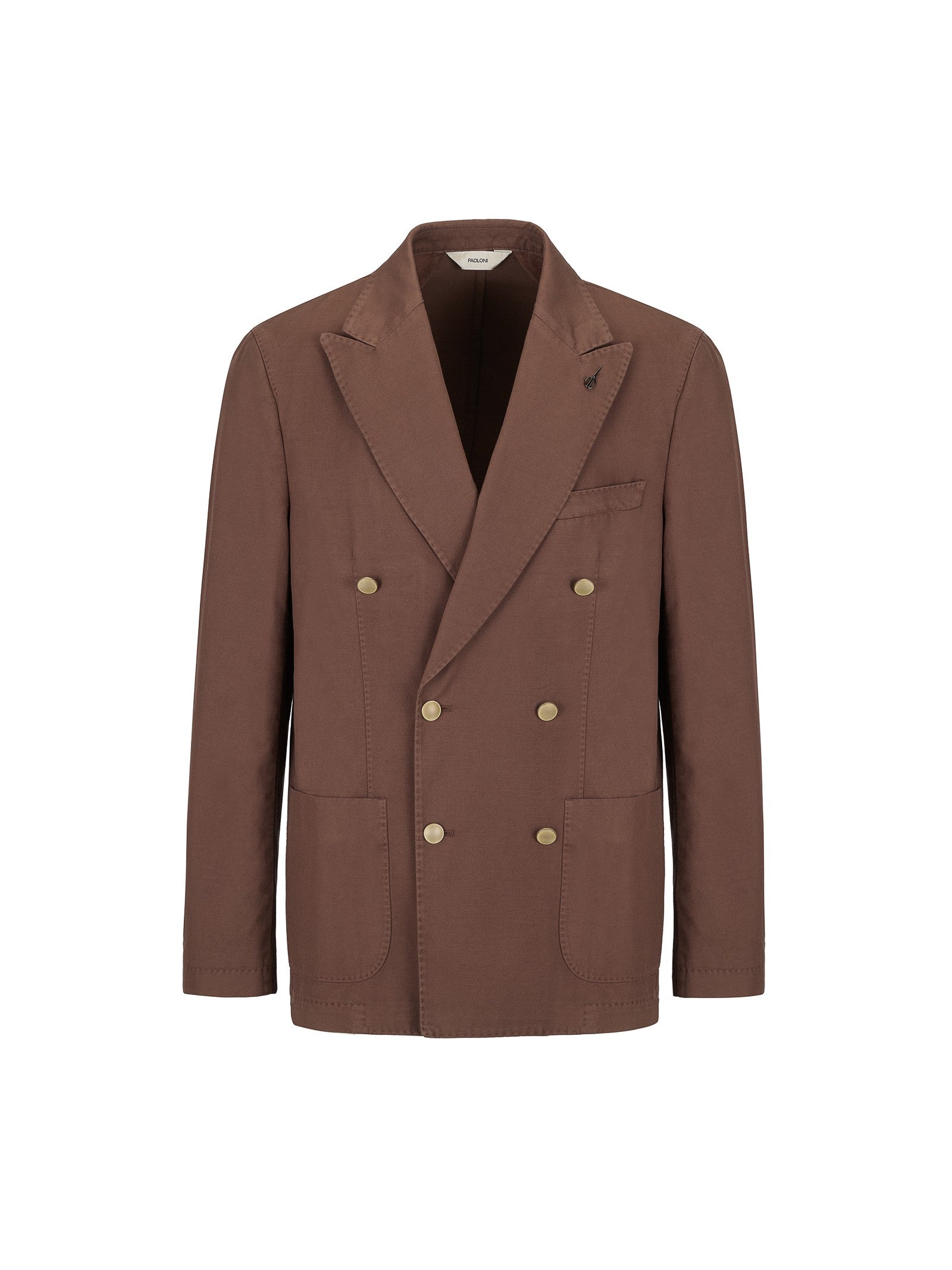 Giacca doppiopetto sfoderata tinta, chiusura con bottoni metallo, ampio rever a lancia, due tasche a toppa un taschino frontali, quattro bottoni ai polsi, spacchi laterali sul retro, finiture con impunture. Twill misto cotone lino stretch