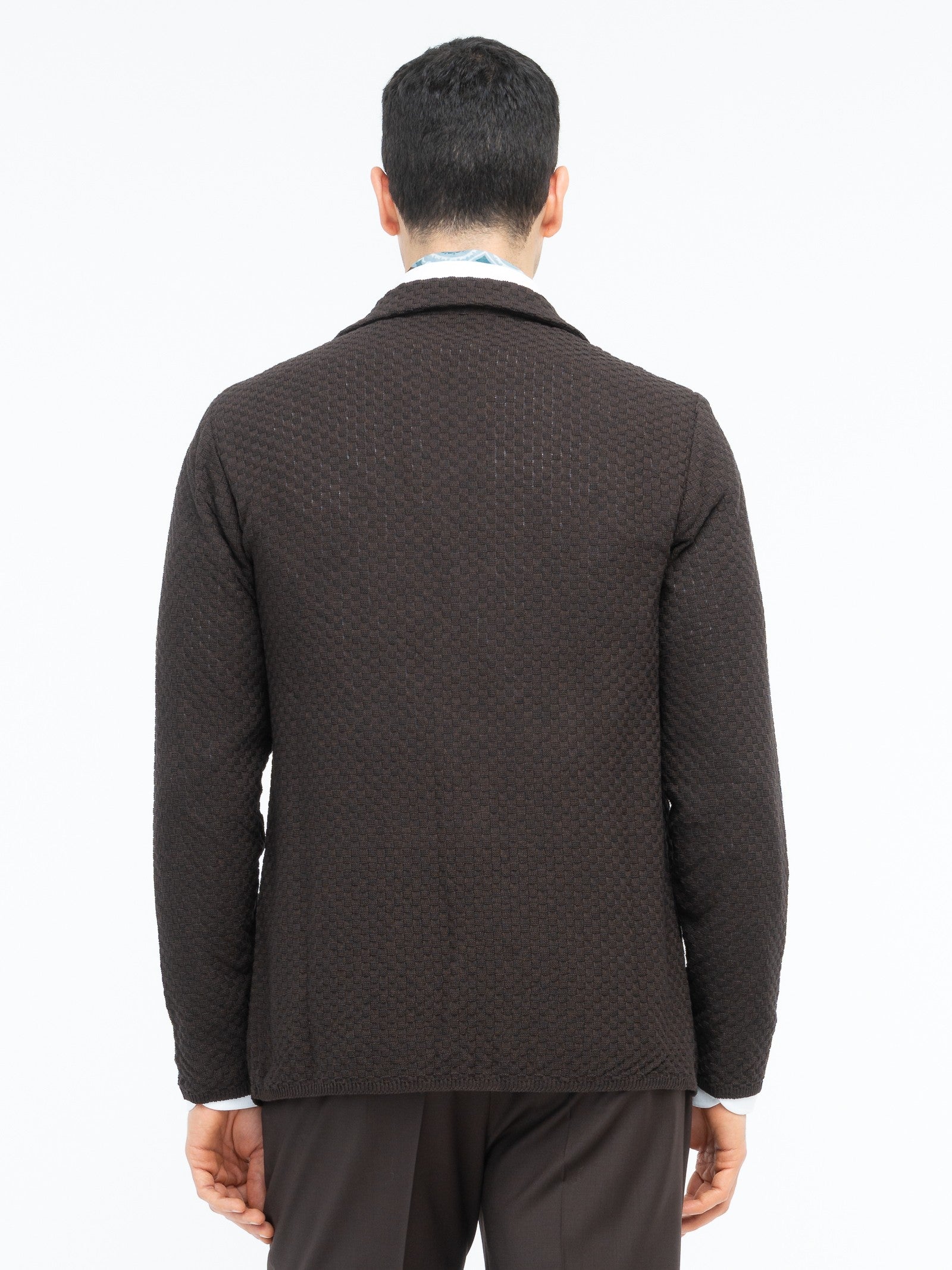 Giacca maglia monopetto, chiusura a due bottoni, due tasche a toppa e un taschino frontali, rever a lancia. Lavorazione a maglia waffle misto cotone