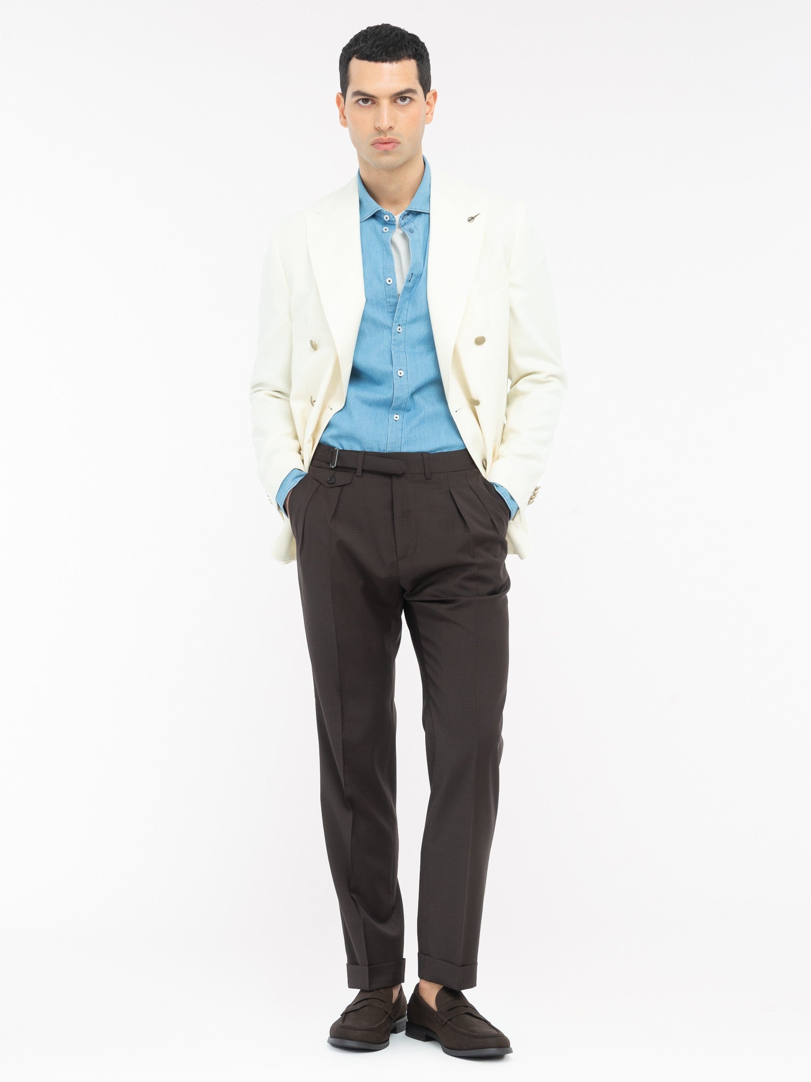 Pantalone doppia pinces wide fit con risvolto sul fondo, due tasche america e un taschino con pattina e bottoncino frontale, due con pattina e bottone sul retro, cintura con regolatore in vita, chiusura con zip, gancio e bottone, fondo 18 cm. Tela in pura lana stretch
