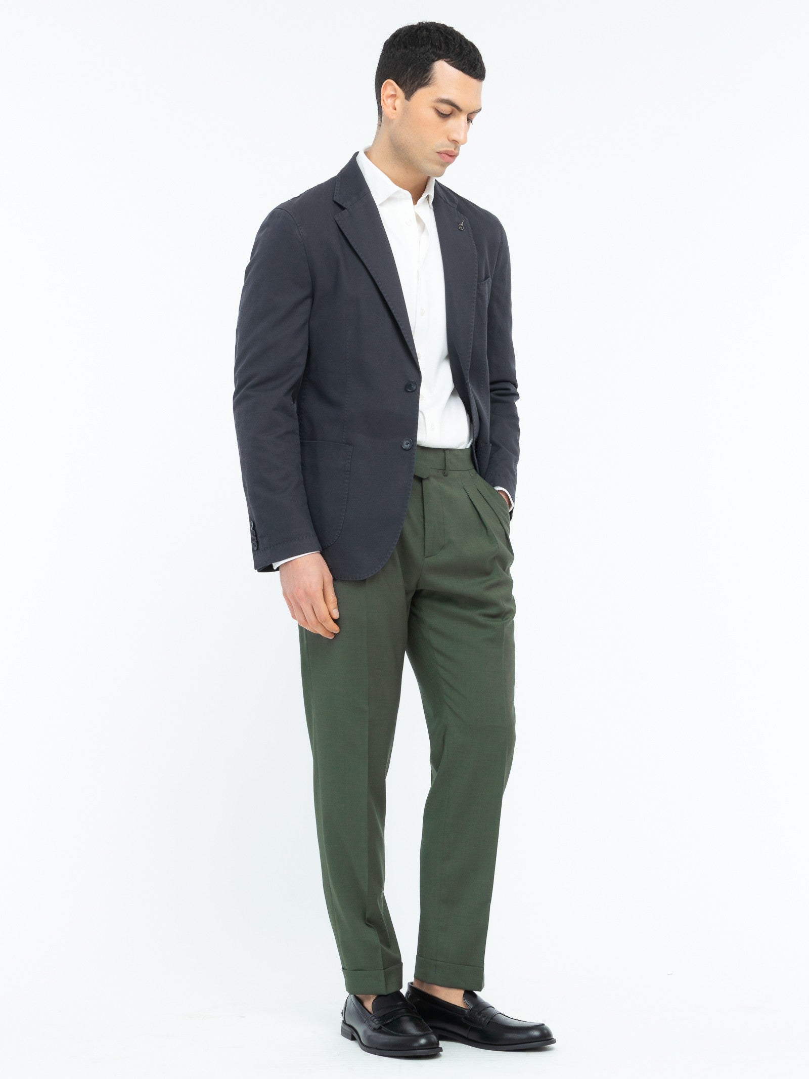 Pantalone doppia pinces wide fit con risvolto sul fondo, due tasche america e un taschino con pattina e bottoncino frontale, due con pattina e bottone sul retro, cintura con regolatore in vita, chiusura con zip, gancio e bottone, fondo 18 cm. Tela in pura lana stretch